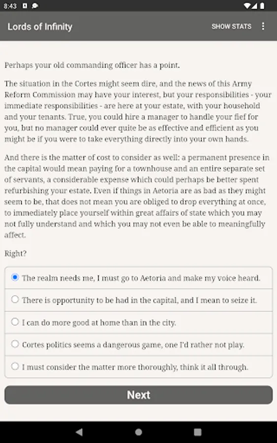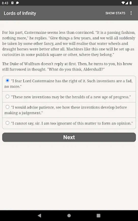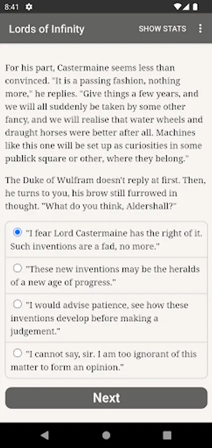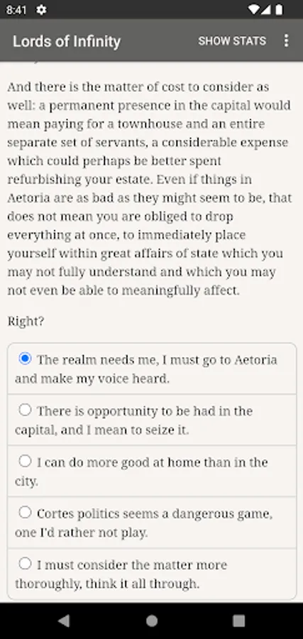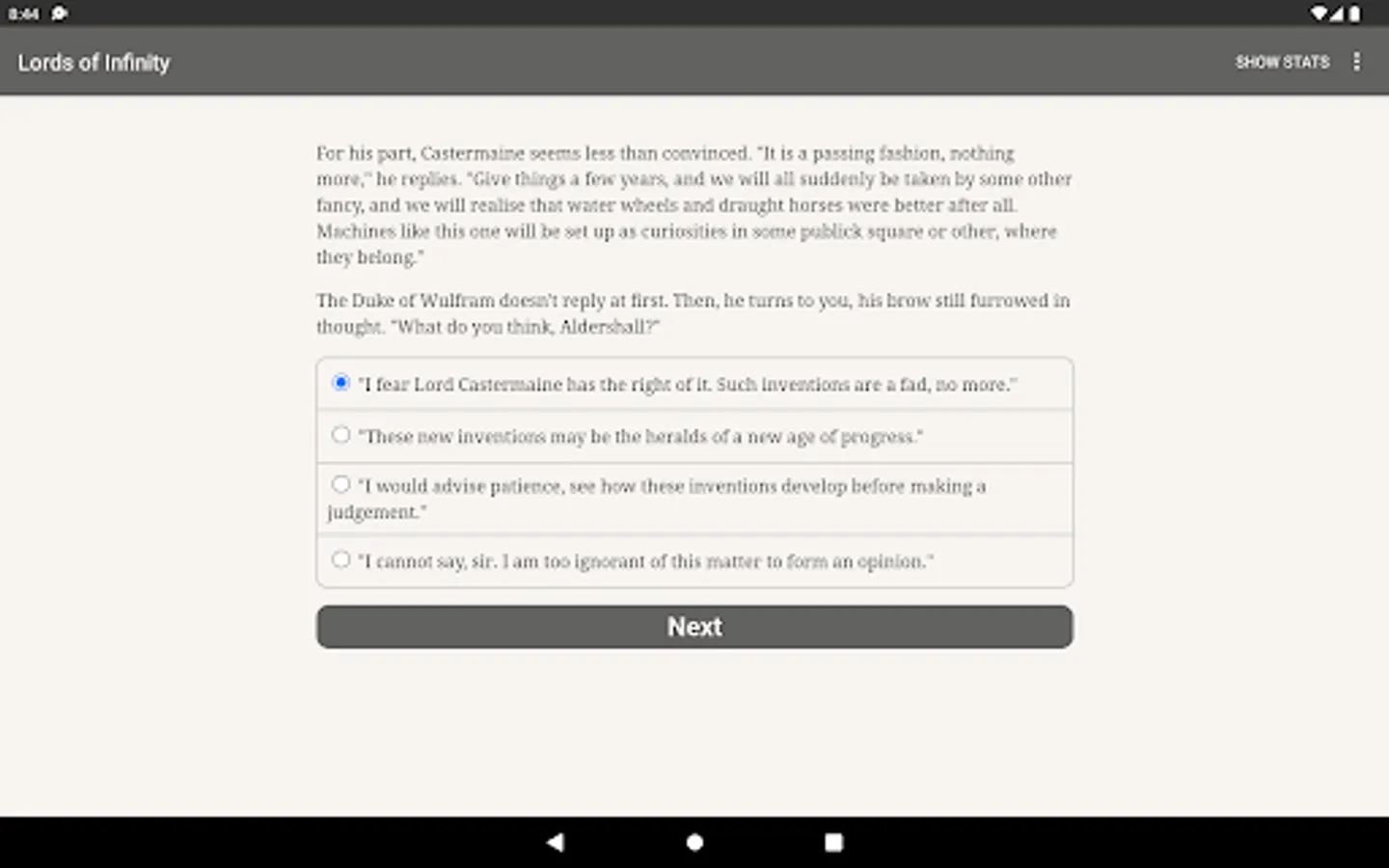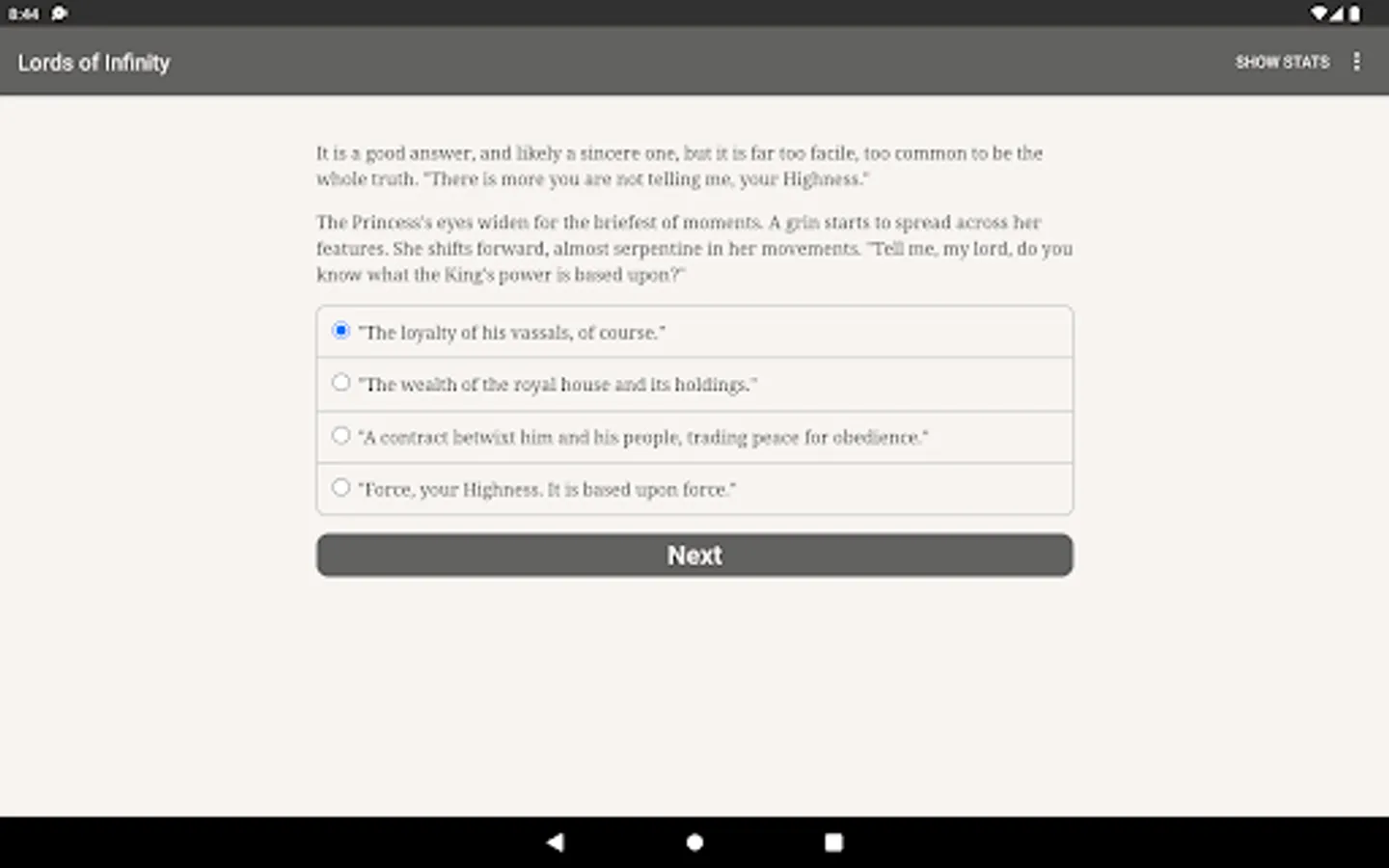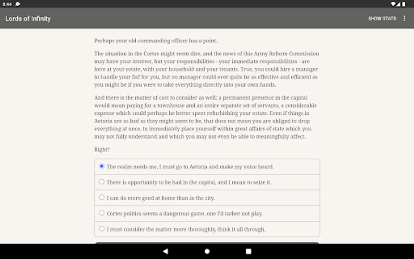 "Lords of Infinity" is an immense 1.6-million-word interactive novel by Paul Wang, author of "Sabres of Infinity," "Guns of Infinity," "Mecha Ace," and "The Hero of Kendrickstone." It's entirely text-based—without graphics or sound effects—and fueled by the vast, unstoppable power of your imagination.