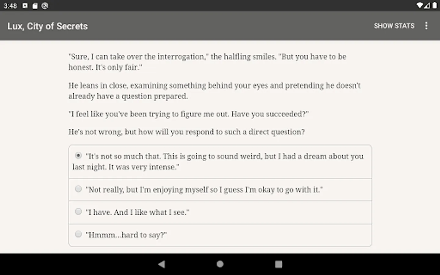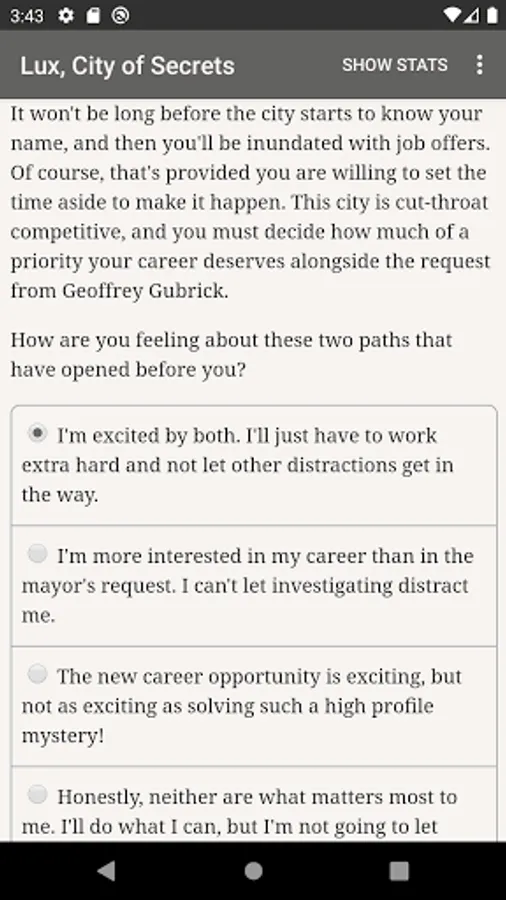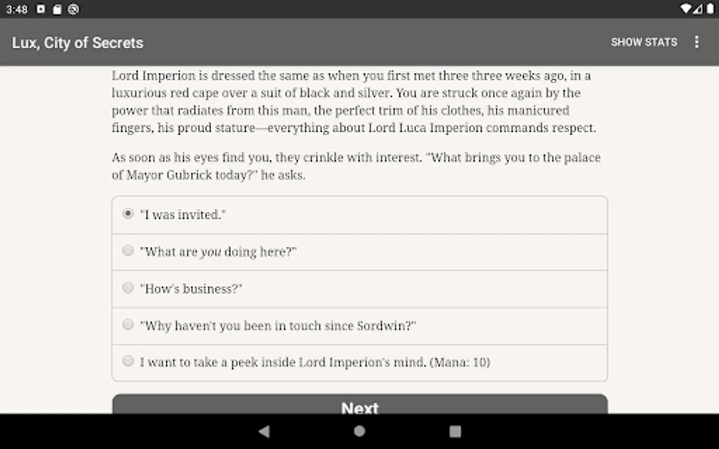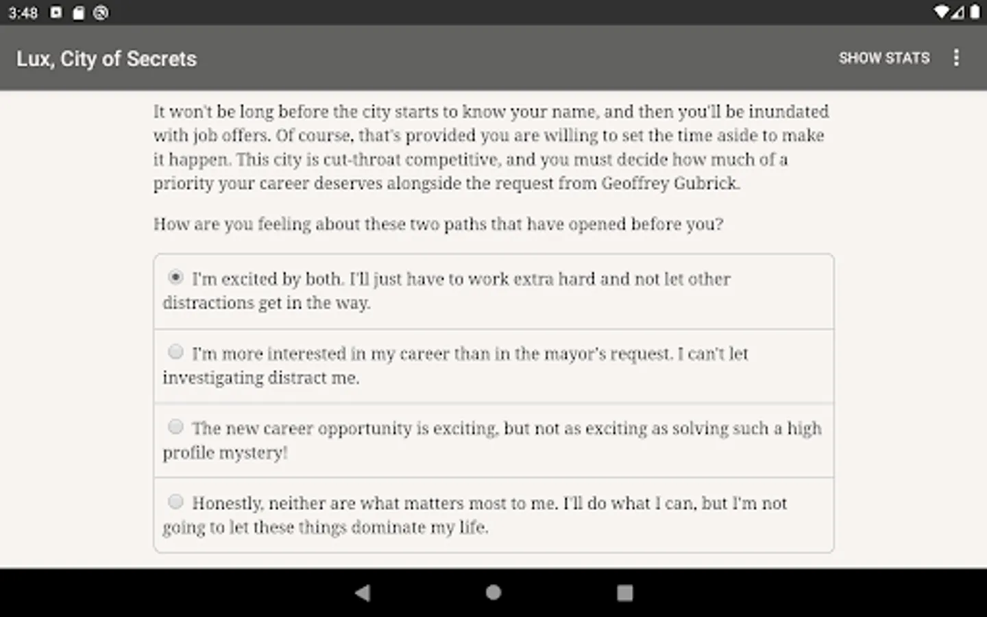 Lux, City of Secrets is a 438,000 word immersive interactive experience by Thom Baylay. It’s entirely text-based--without graphics or sound effects--and fueled by the vast unstoppable power of your imagination.