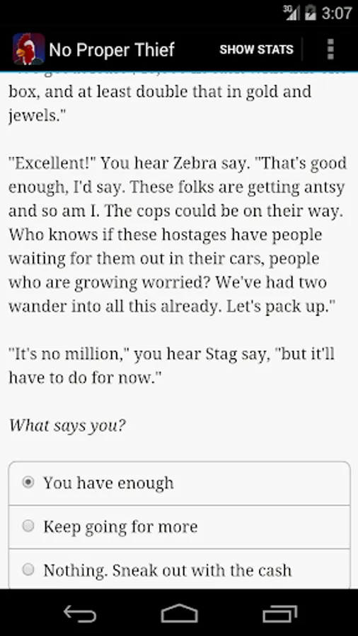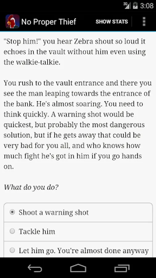 You never wanted a life of crime, but it's all you know. That doesn't mean transitioning from a life as a cocky con artist to a greenhorn bank robber doesn't scare you. In No Proper Thief you are Clyde Lamm, the Rooster, and you have a choice to make. In fact, you have dozens of choices to make throughout your upcoming adventure. Everything has consequences, too. You and your team, consisting of the leader Zebra, the muscle Stag, and the heart Marlin, have many obstacles to overcome. Still, in the midst of all the dark chaos of the initial robbery, there is a flame of positivity: an attractive young bank manager. Sure you stole her gold heirloom ring a while back, but it's a fair trade because that fox is stealing your heart.