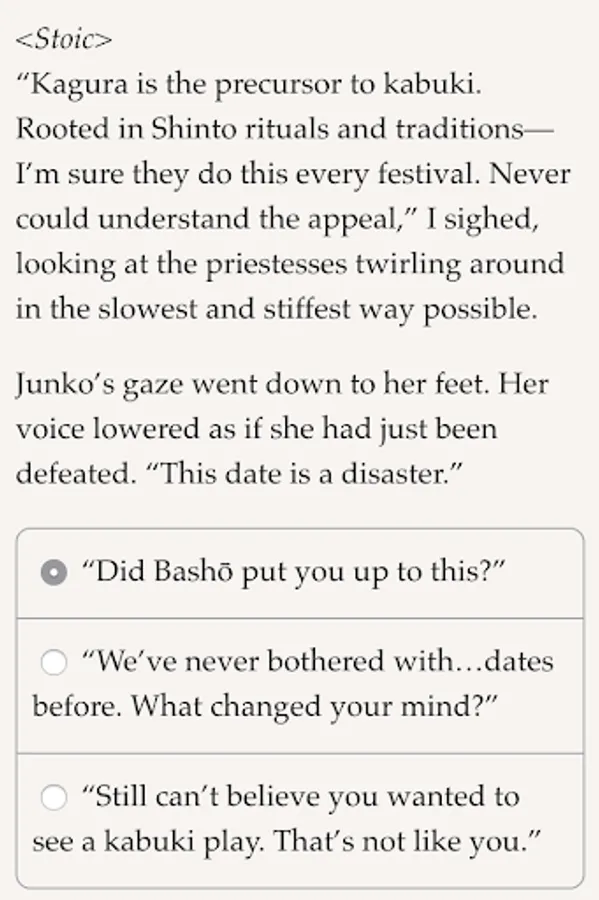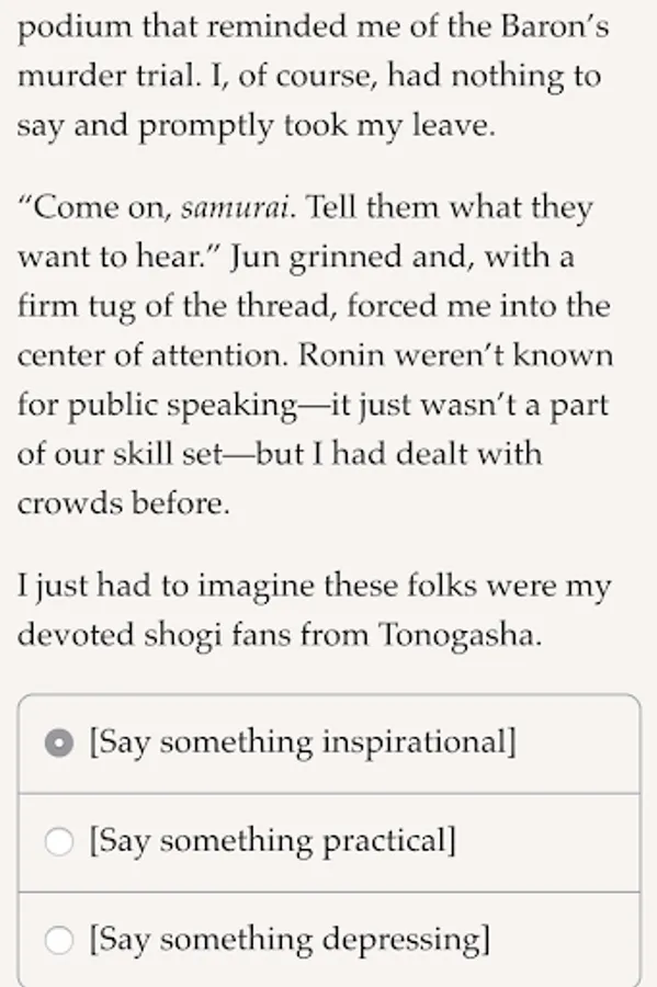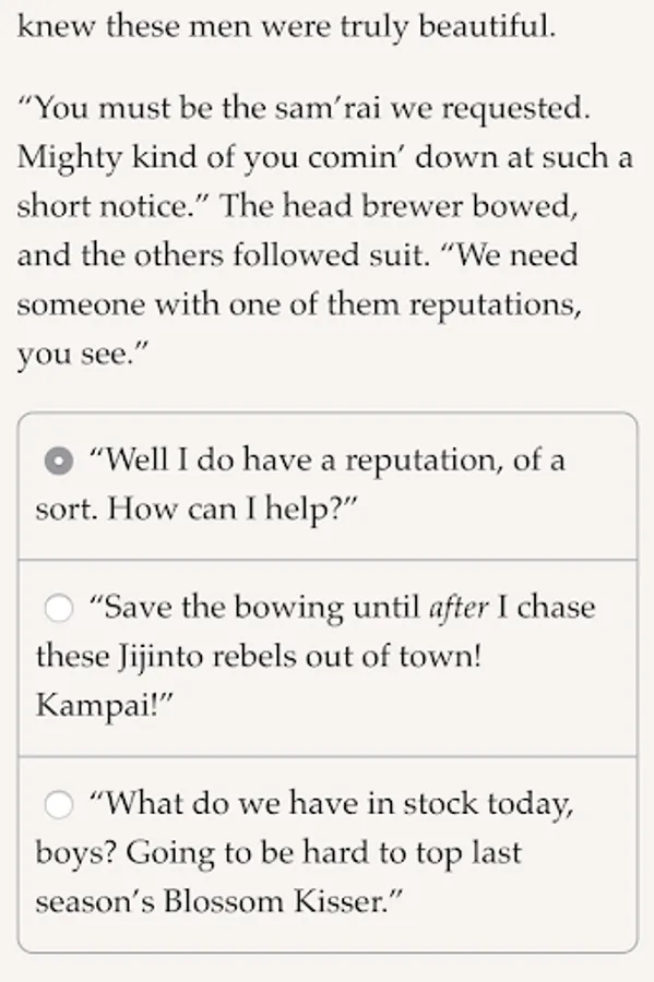 "Samurai of Hyuga Book 4" is a 375,000 word interactive fantasy novel by Devon Connell, where your choices control the story. It's entirely text-based—without graphics or sound effects—and fueled by the vast, unstoppable power of your imagination.