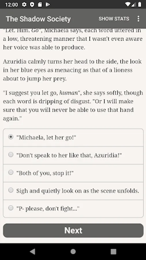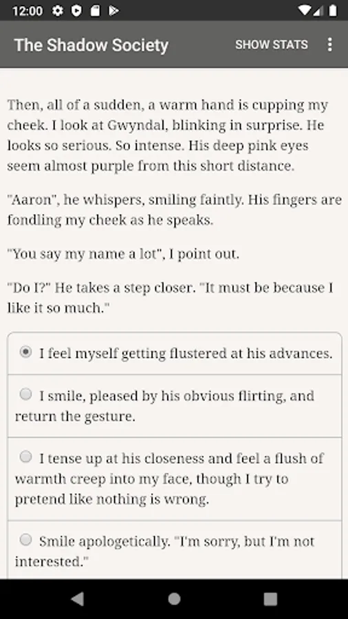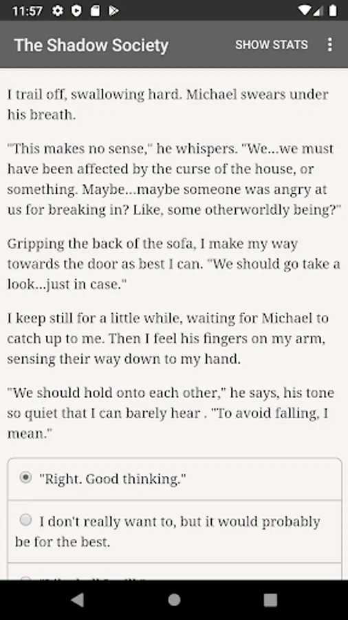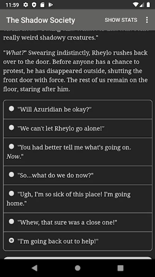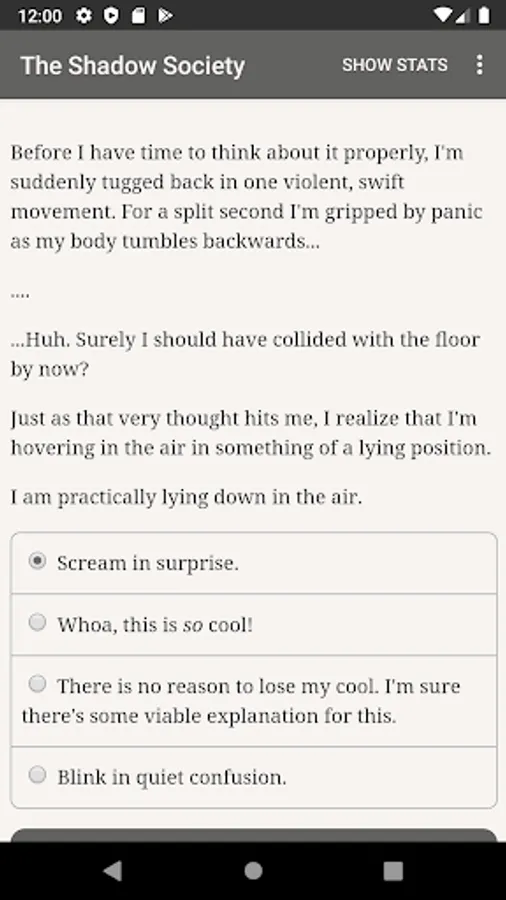 “The Shadow Society” is a 675,000-word interactive modern fantasy novel by Cara Palmer, where your choices control the story. It's entirely text-based—without graphics or sound effects—and fuelled by the vast, unstoppable power of your imagination.