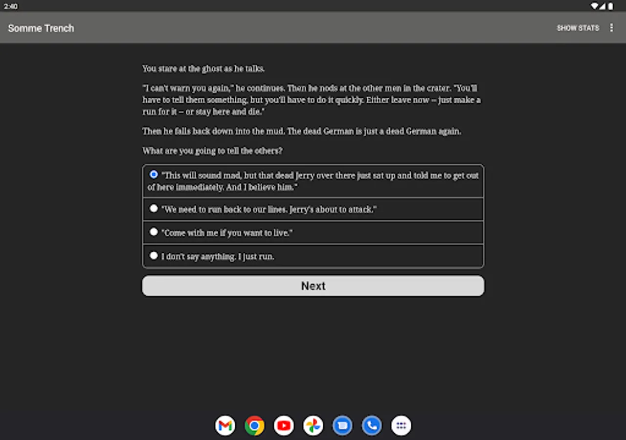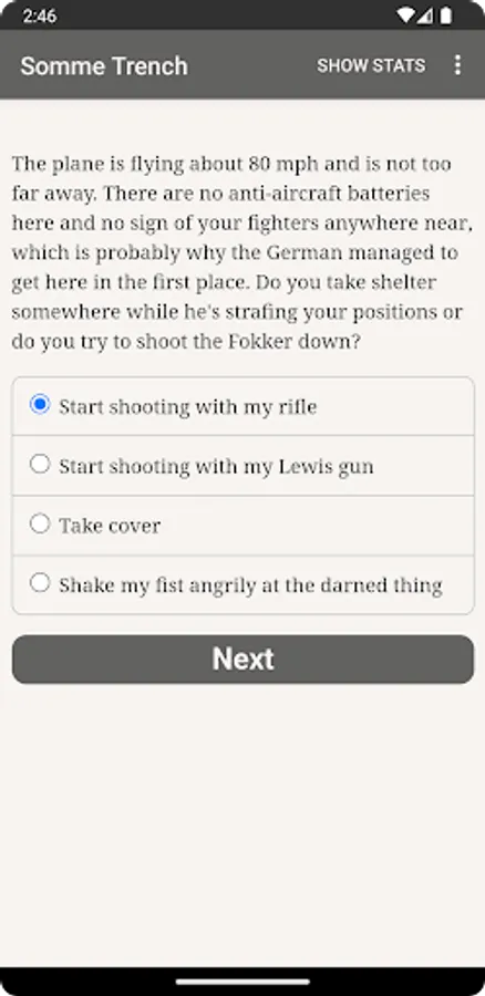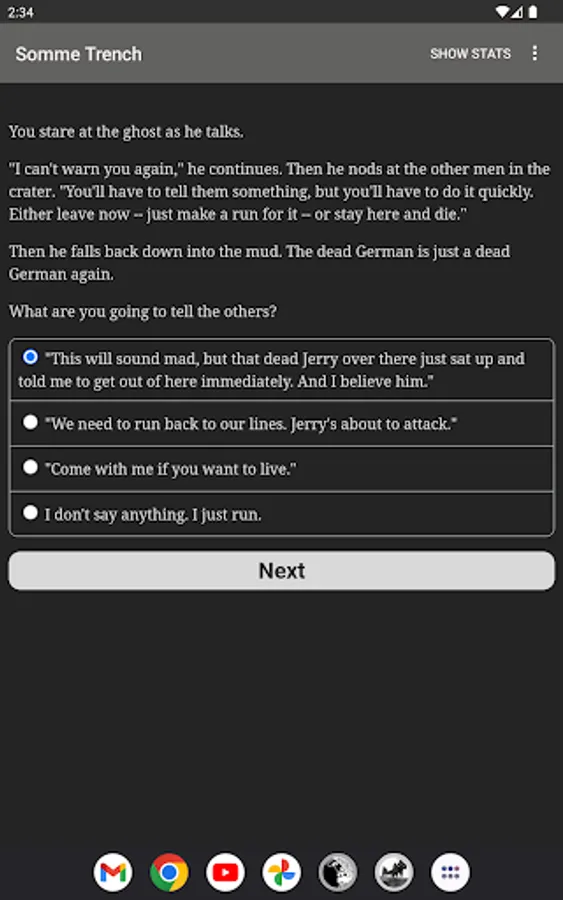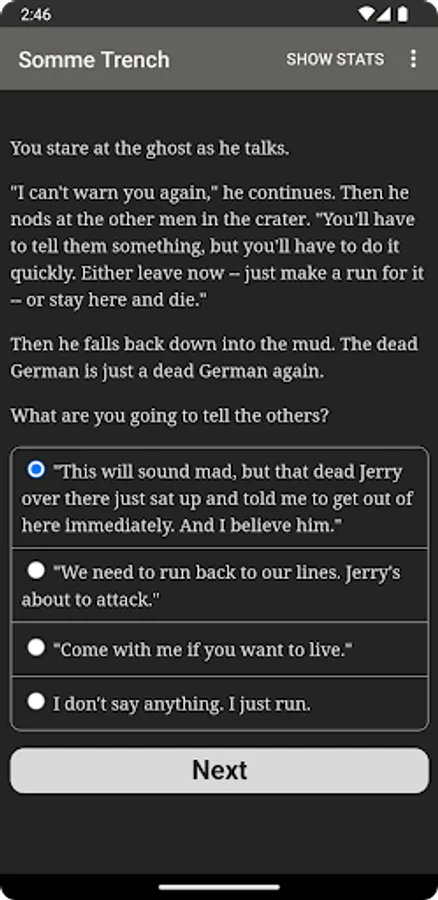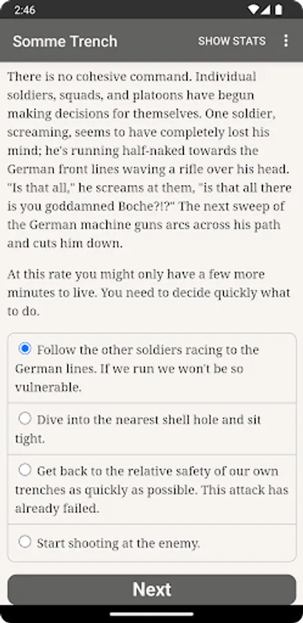 "Somme Trench" is an interactive historical novel by Andrew J. Schaefer, where your choices control the story. It's entirely text-based—without graphics or sound effects—and fueled by the vast, unstoppable power of your imagination.