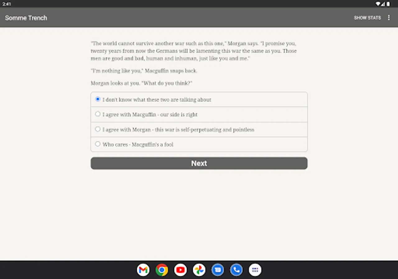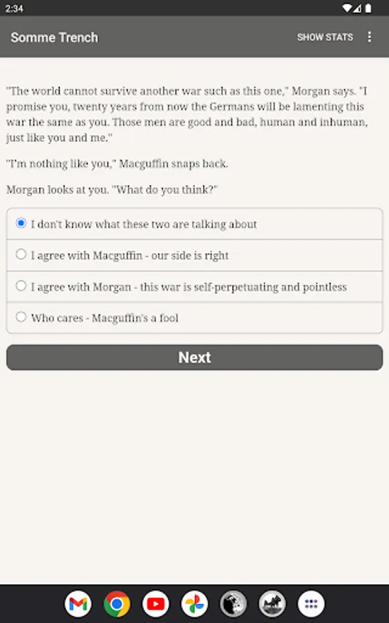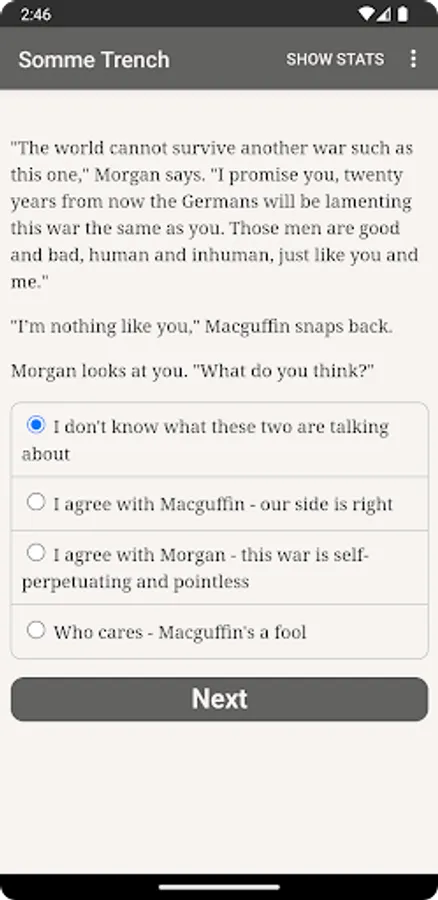 Your best bet might be as an airplane gunner, or a trench fighter, or even as a stretcher bearer. Firing squads, brothels and homeward-bound steamships are all in your possible future. Or you might give in to your inner demons and wind up chatting with ghosts and skeletons as though they're your friends. Whatever path you choose, you'll be immersed in a richly detailed, interactive historical novel that has almost as many twists and turns as there were soldiers at the Somme.