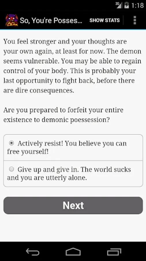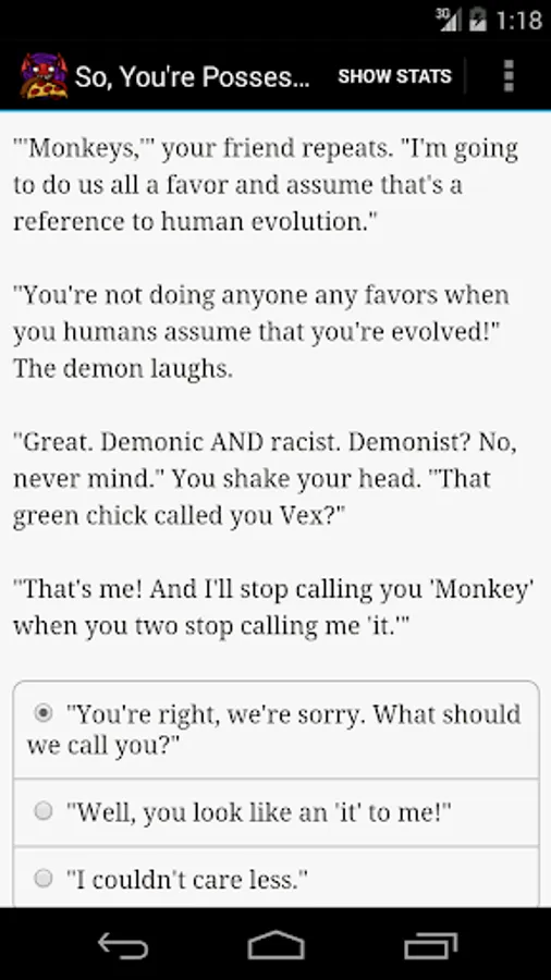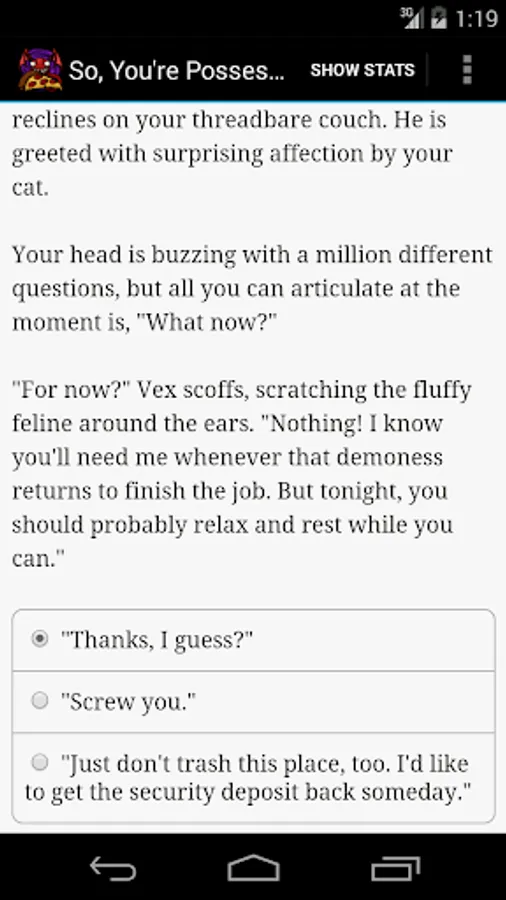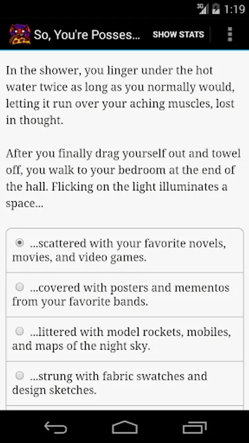 So, You're Possessed! is a 50,000-word contemporary fantasy novel where your choices impact how the tale unfolds. It's entirely text-based—without graphics or sound effects—and fueled by the vast, unstoppable power of your imagination.