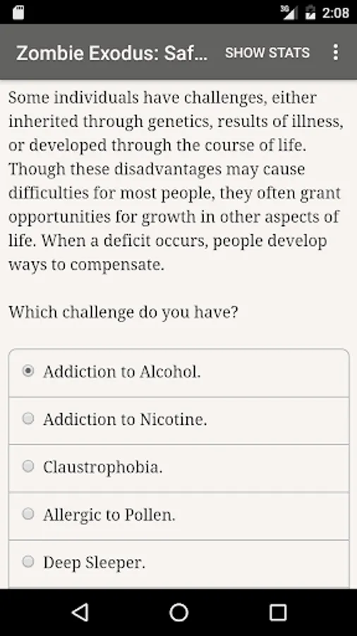 • Select optional challenges for your survivor. Take care of a dependent child or a pet, or deal with a phobia, compulsion, addiction, or affliction.