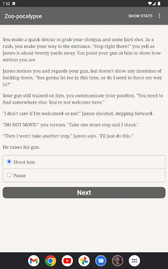This 50,000 word interactive fiction novella is written by Tyler S. Harris. The story is broken up into 3-4 chapters depending on how it is played. It is completely text-based, with no sound effects or graphics. Vastly different endings can occur based on the decisions you make.