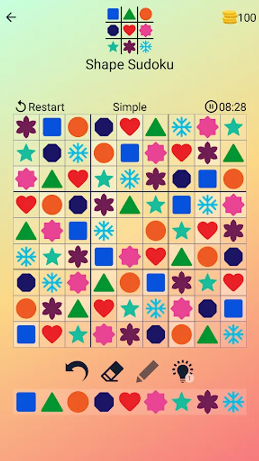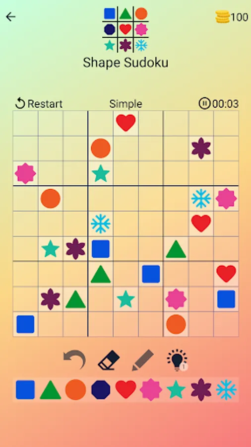 Play Sudoku with 9 shapes unlike classical sudoku. 4 different levels and over than 10000 puzzles wait for you.