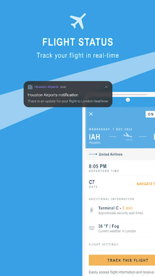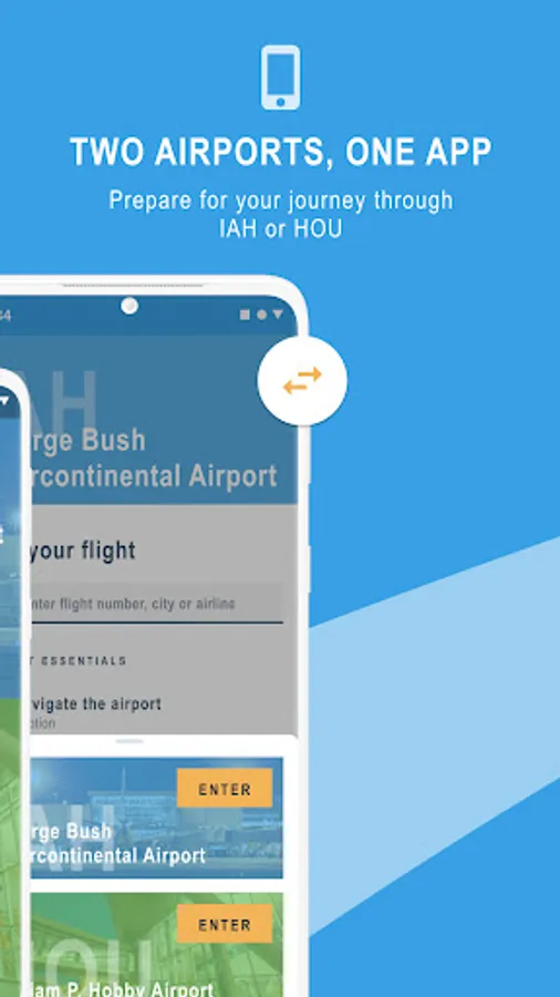 Houston Airports’ official mobile app easily helps you find your way straight to your gate or any point along the way at IAH and HOU with these stress-reducing and time-saving features: