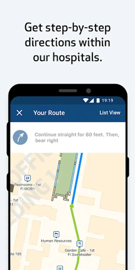 Wayfinding: If you’re at one of our hospital locations, use this feature to navigate to clinic and imaging appointments, dining options, gift shops, ATMs, parking garages and more.