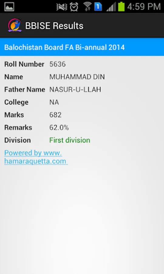 Find results from Balochistan board results. We provide latest and previous years results for Matric, FA/FSc, BA/BSc, MA/MSc. You can search using roll number and name. This app enables you to take whole result with you, and with a 3G or 4G enabled device you can get result whenever it is announced and uploaded, no matter where you are. You just need your Android device. This App is developed by hamaraquetta.com to answer the needs of students using the latest 3G and 4G android devices.