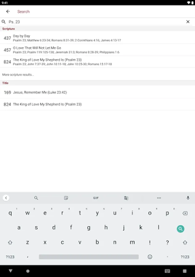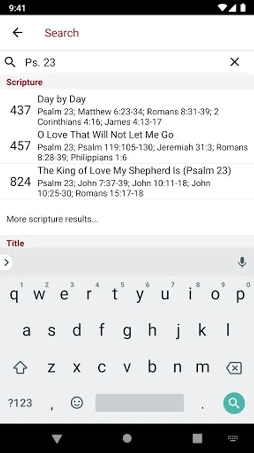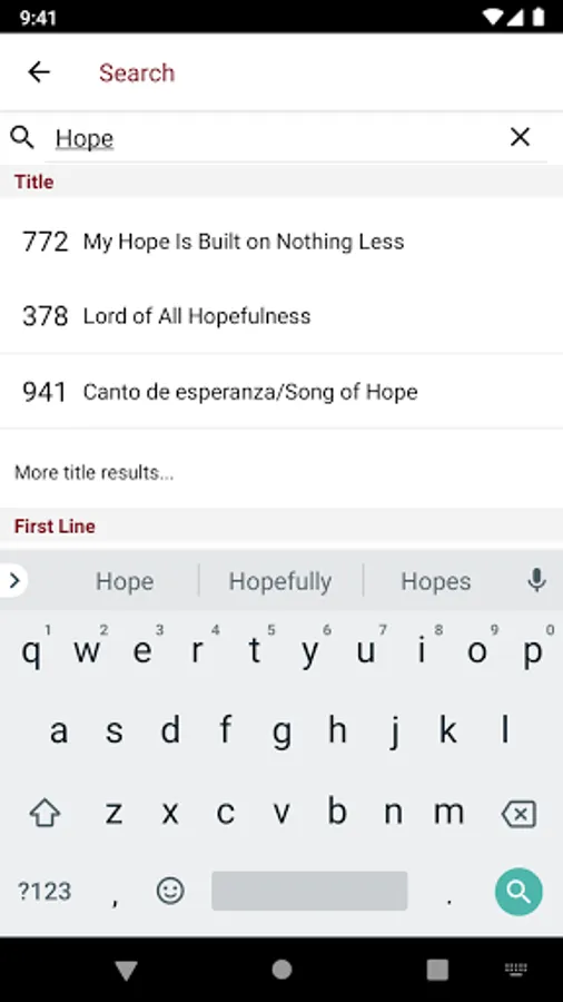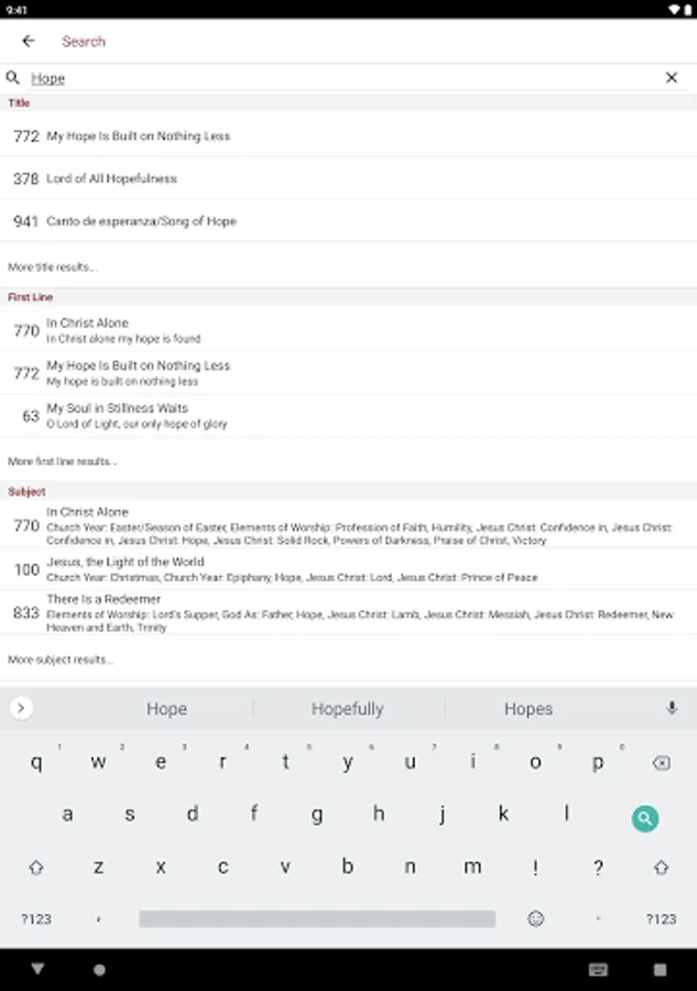 The search box allows you to search for songs by first line, author, composer, topic, tune, meter or scripture passages quoted or alluded to. A handy keypad lets you jump immediately to a song by number.