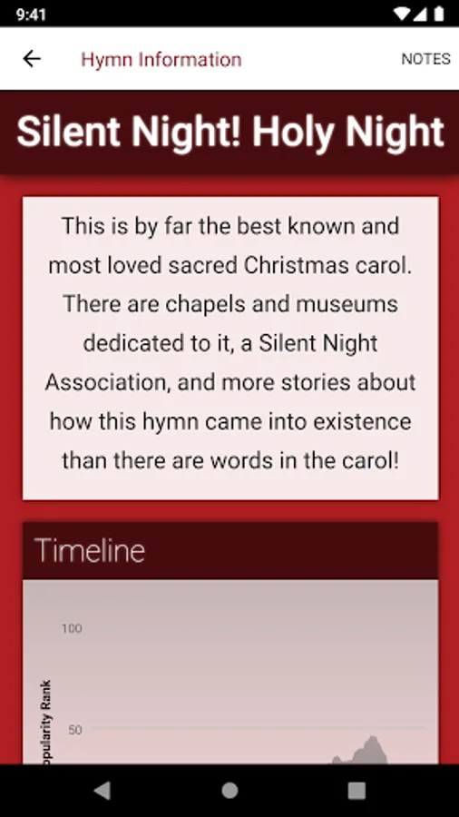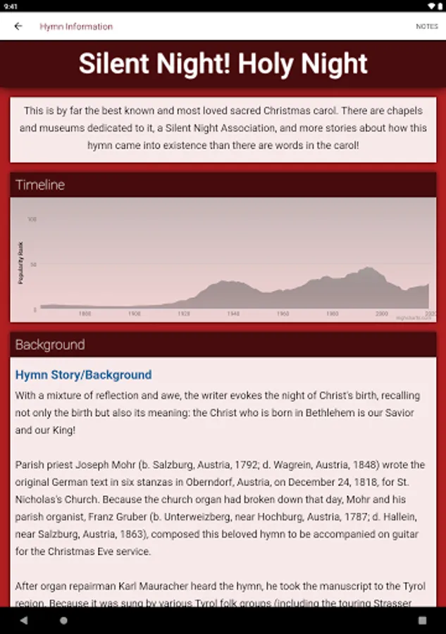 For each song there is information that may include a description of the song, a brief biography of the author or composer, and information for worship leaders such as performance suggestions and available arrangements. Brief audio clips are also available for most songs.