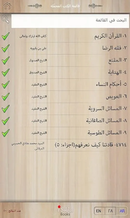 - Book list by category, title, author, publisher or source, with the ability to filter the language of displayed book (Arabic/Farsi/English).