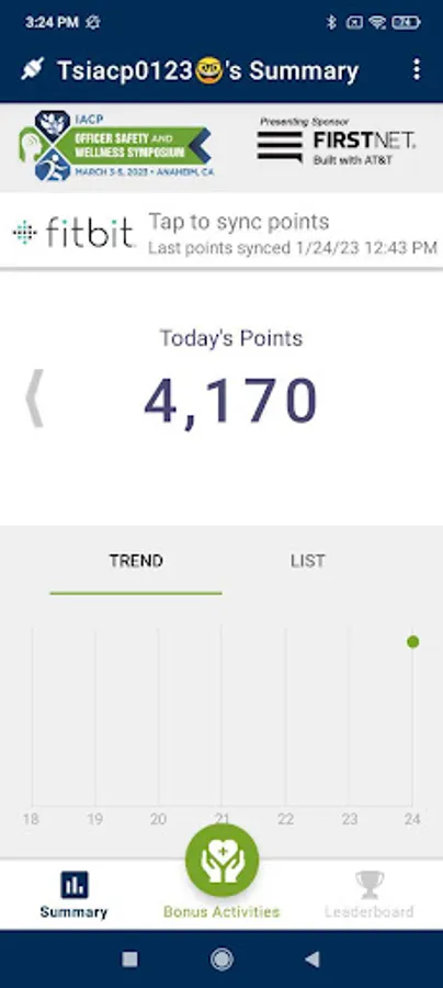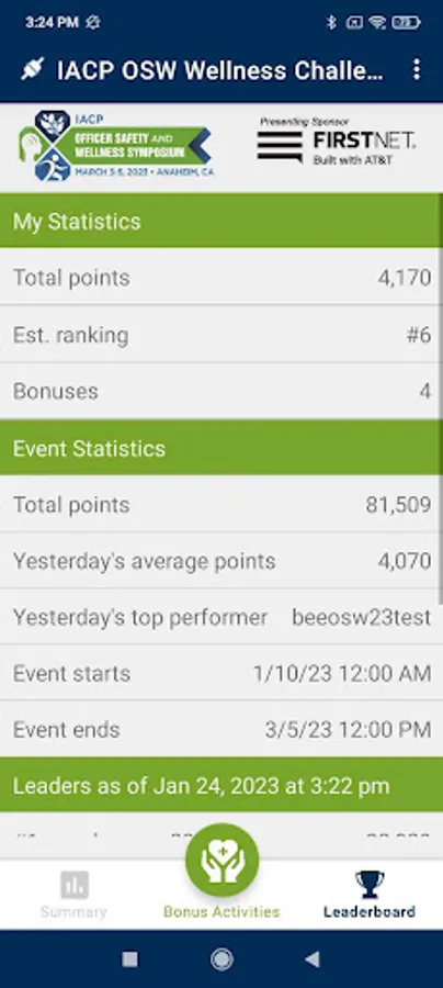 App supporting the IACP OSW Wellness Challenge, sponsored by First Net Built with AT&T. The Challenge encourages event attendees to engage in healthy activities and some friendly competition, and win prizes.