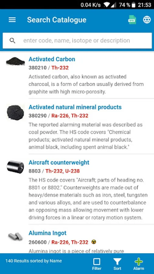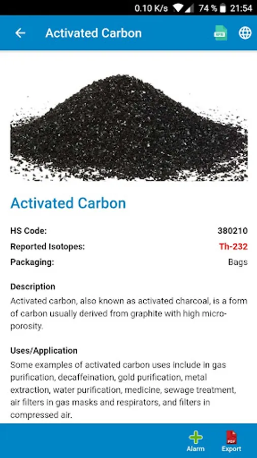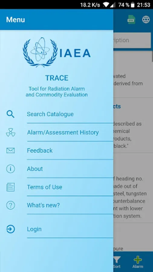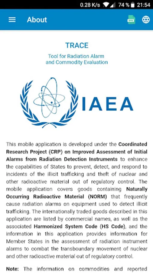 This mobile application is developed under the Coordinated Research Project (CRP) on Improved Assessment of Initial Alarms from Radiation Detection Instruments to enhance the capabilities of States to prevent, detect, and respond to incidents of the illicit trafficking and theft of nuclear and other radioactive material out of regulatory control and it covers the description of good containing Naturally Occurring Radioactive Material (NORM) used in international trades and Harmonized System Code (HS Code) and serves as a guidance for member States in proper assessment of radiation instrument alarms to combat the trans-boundary movement of nuclear and other radioactive material out of regulatory control.