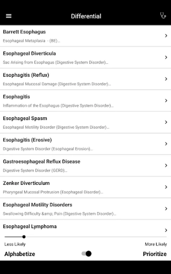 Weights of corroborative findings are added up in real-time to rapidly create lists of possible differential diagnoses for your consideration.