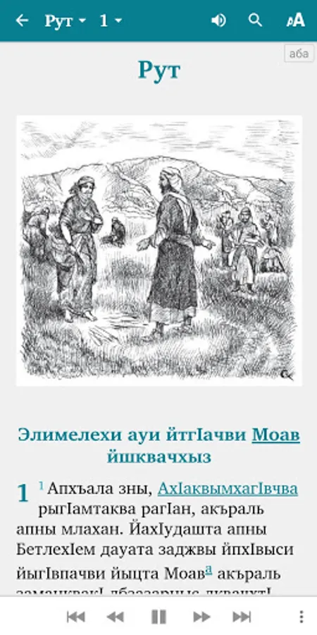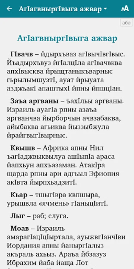 The app includes dictionary links to the key terms and a short glossary of key terms. Also includes audio for Abaza texts (an Internet connection is needed for streaming listening or for the first download of each audio file to the smartphone's internal memory, with subsequent offline listening).