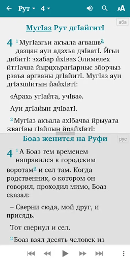 This Scripture app facilitates Bible study in the Abaza language. The Russian translation (NRT) can optionally be added in parallel to the Abaza text. Users can highlight verses in different colors, make bookmarks, write notes and view their reading history.