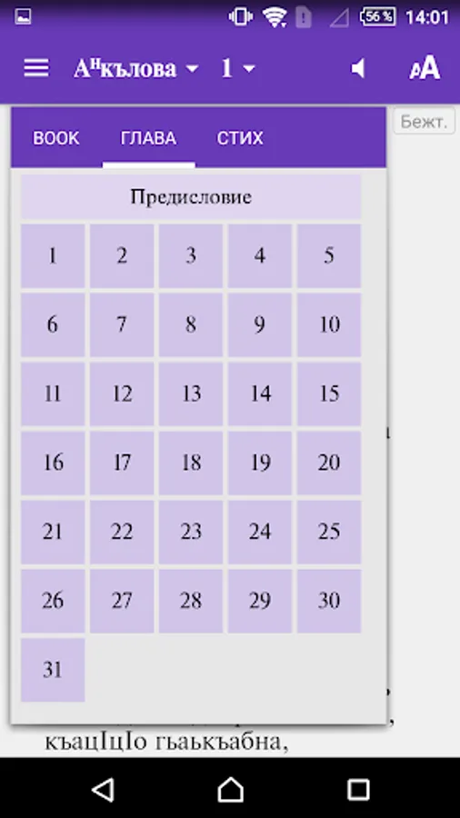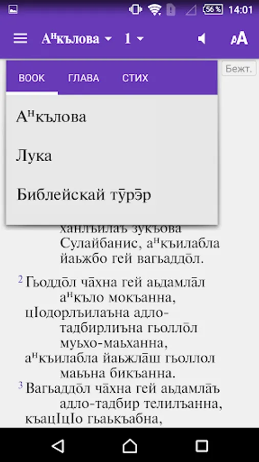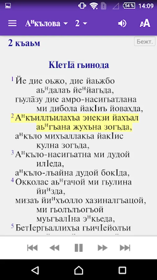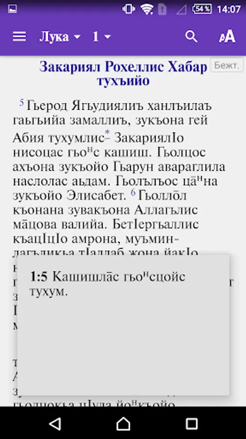 This application provides an opportunity to get acquainted with the Holy Scriptures. It contains both the Bezhta translation itself, as well as the Avar translation, which can be displayed in parallel on demand. Users can highlight verses in different colors, place bookmarks, write notes and see the reading history.