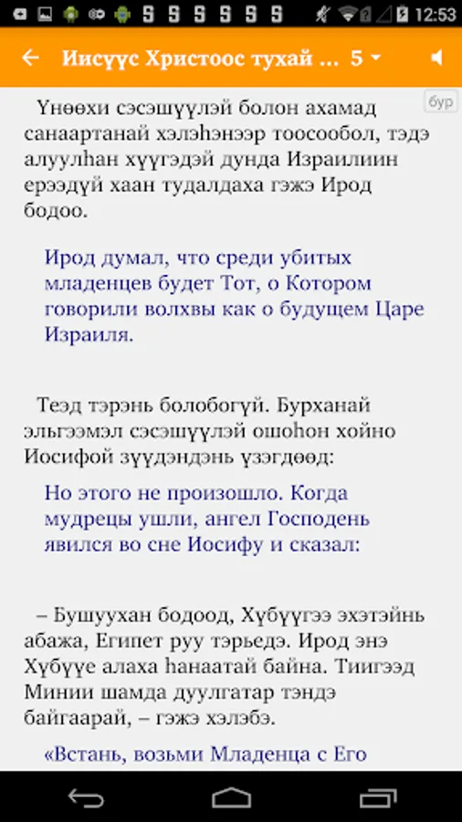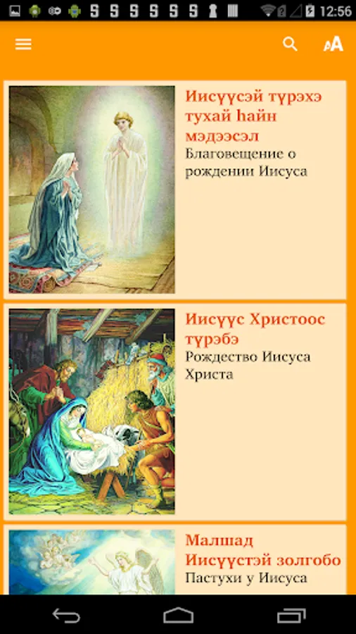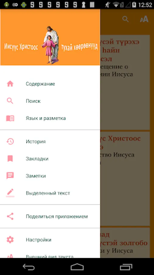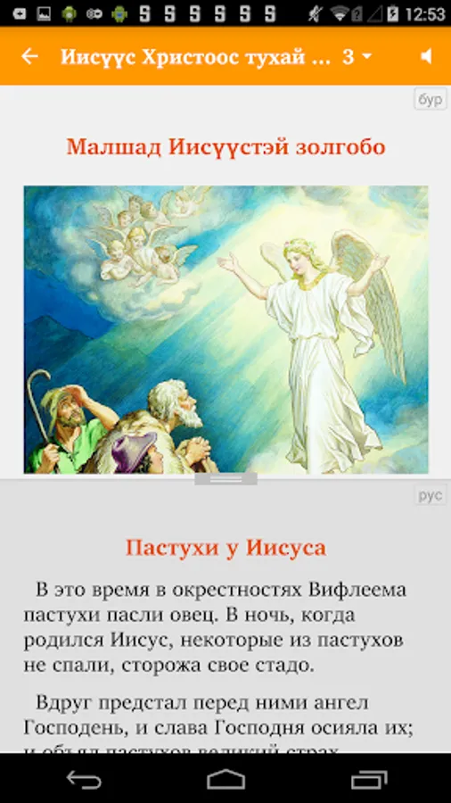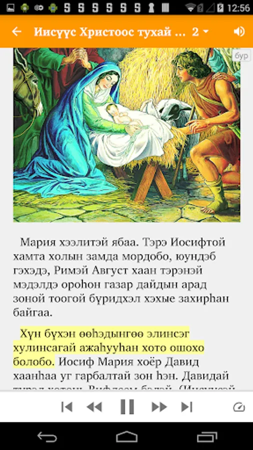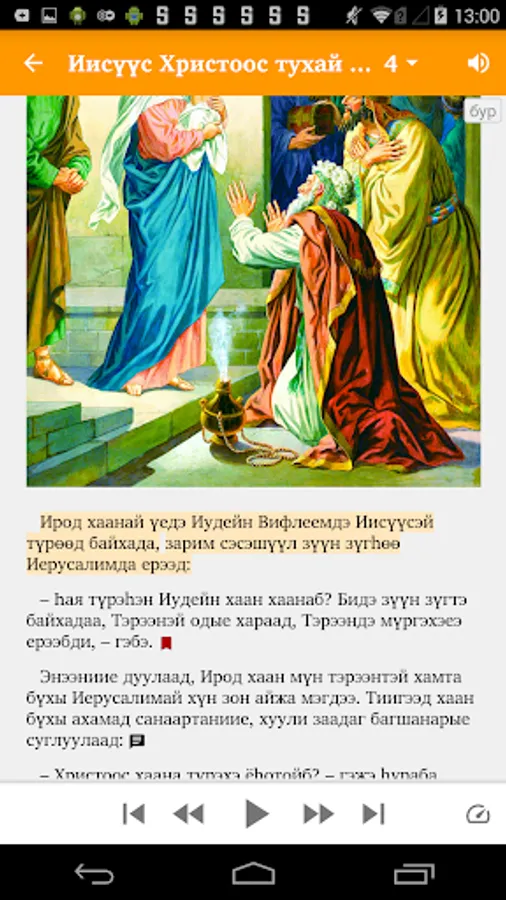 An app of Illustrated Stories about Jesus in the Buryat language for children and adults. Includes audio that has been synchronized with the Buryat text (an Internet connection is needed for the first download of each audio file to the smartphone's internal memory, with subsequent offline listening).