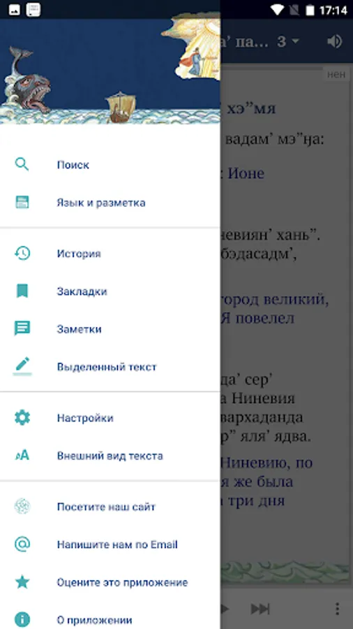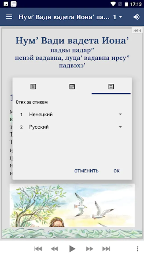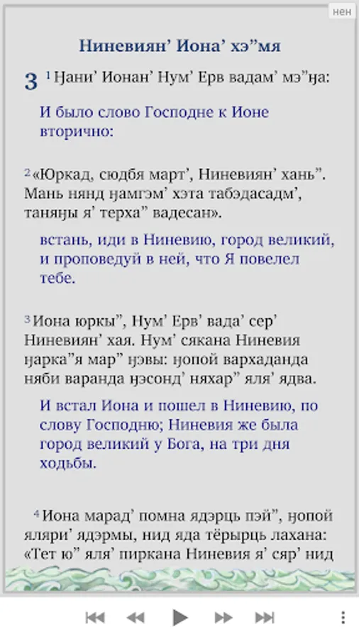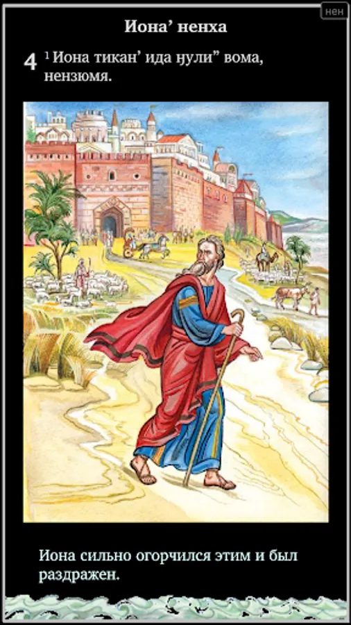 The illustrated Jonah app in Nenets for children and adults. This Scripture app facilitates Bible study in the Nenets language. Includes audio that has been synchronized with the Nenets text (an Internet connection is needed for streaming audio or for the first download of each audio file to the smartphone's internal memory, with subsequent offline listening). Each line of text is highlighted when the corresponding audio fragment is played, if this option is not turned off in the app's settings. The Russian translation can optionally be added in parallel to the Nenets text, or it can be viewed in verse by verse mode. Users can highlight verses in different colors, make bookmarks, write notes and view their reading history.