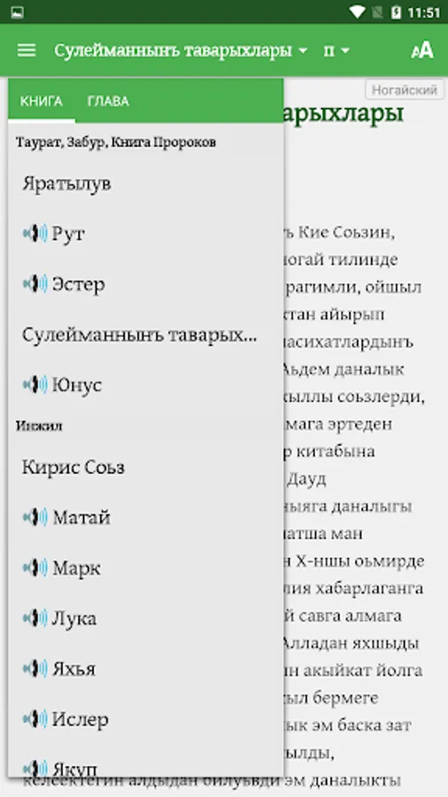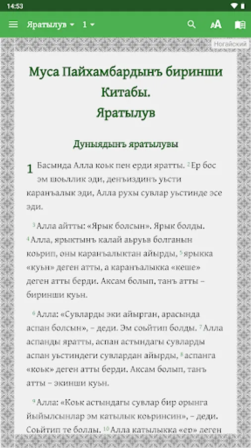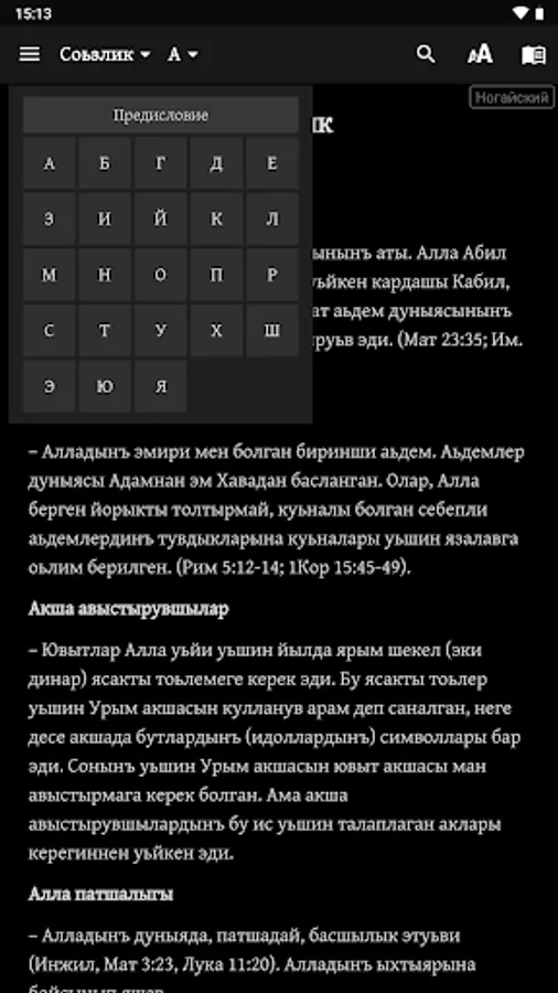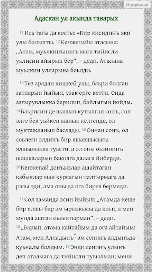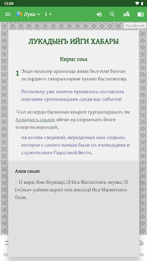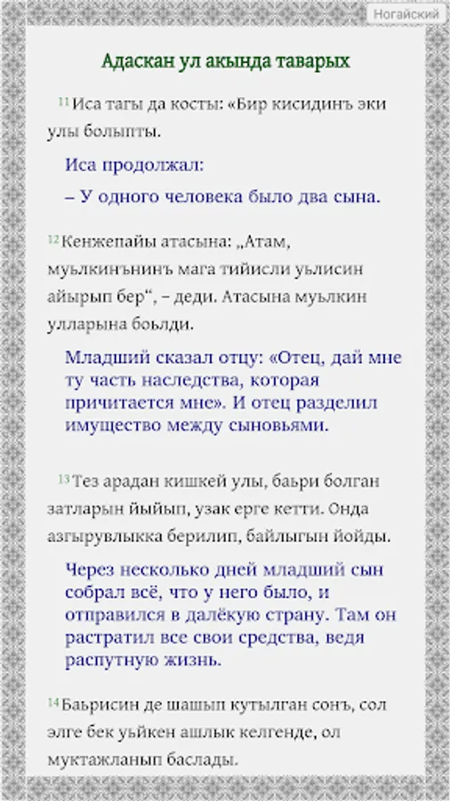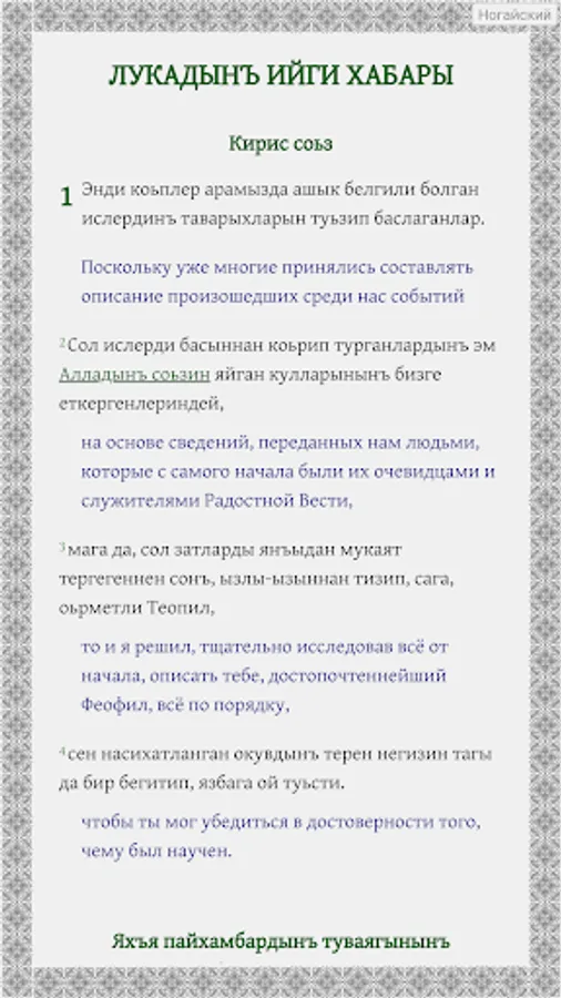 This application provides the opportunity to study the Scriptures. It contains the translation into Nogai itself, as well as a Russian translation. These translations can be displayed side by side on demand. Users can highlight verses in different colors, place bookmarks, write notes and view the reading history.