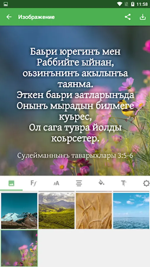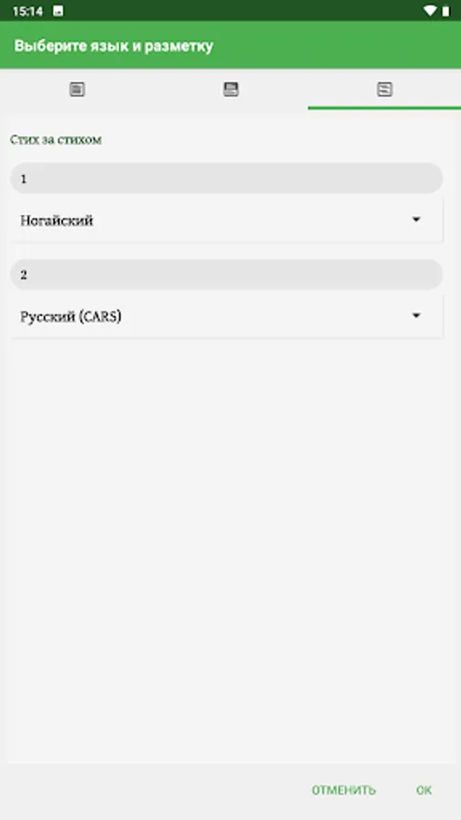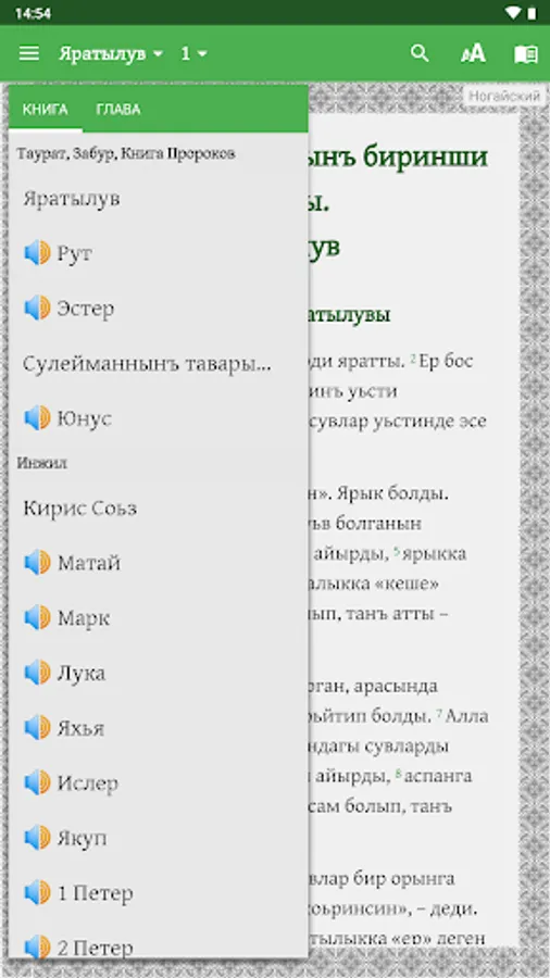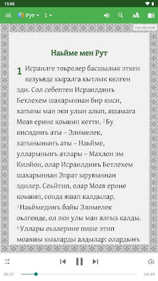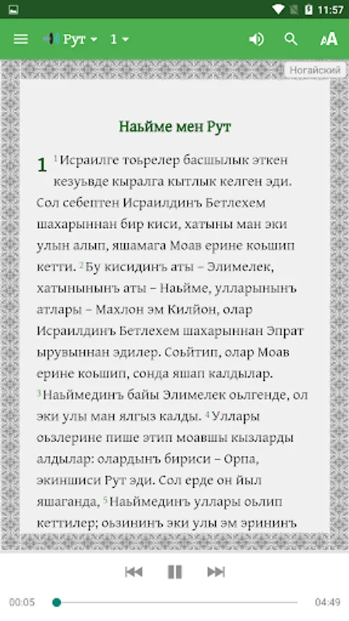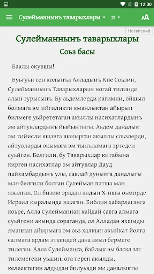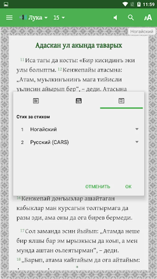 This application provides the opportunity to study the Scriptures. It contains the translation into Nogai itself, as well as a Russian translation. These translations can be displayed side by side on demand. Users can highlight verses in different colors, place bookmarks, write notes and view the reading history.