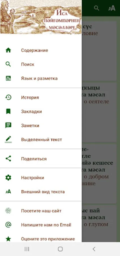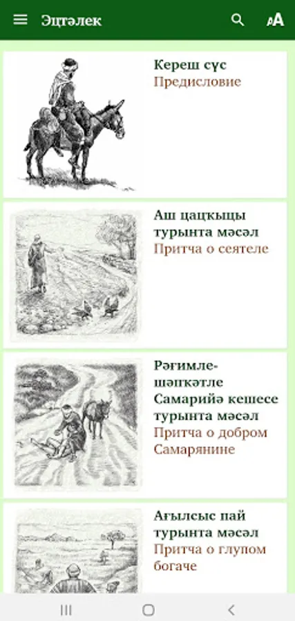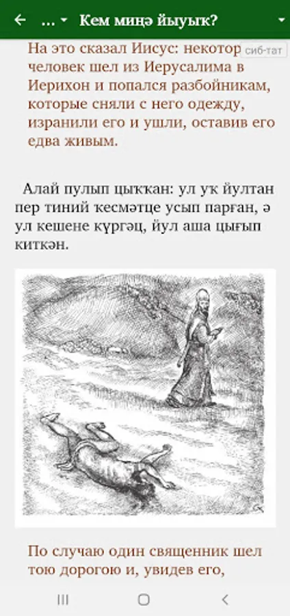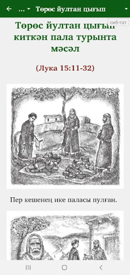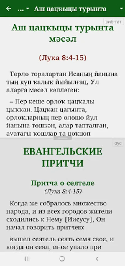 Иса пәйғәмпәрнең мәсәлләре - This Scripture app facilitates Bible study in the Siberian Tatar language. Users can highlight the text with different colors, make bookmarks, write notes and view their reading history. The Russian Synodal translation can optionally be added in parallel or in verse-by-verse mode to the Siberian Tatar text. The app includes a verse-on-image editor, which means that parts of the text can be placed on the background of a picture from the app gallery or from the user’s smartphone memory and shared via email or social nets.