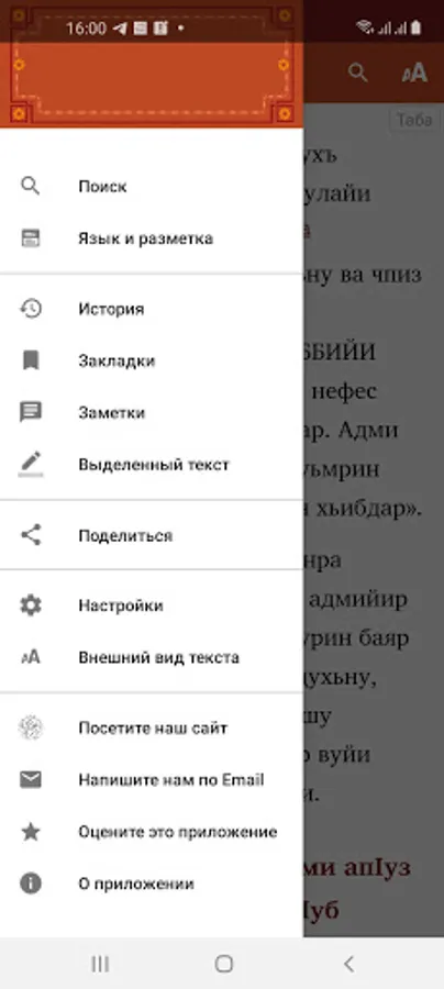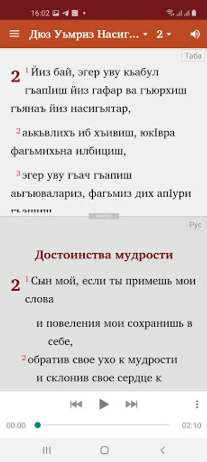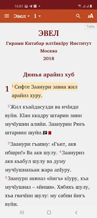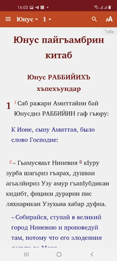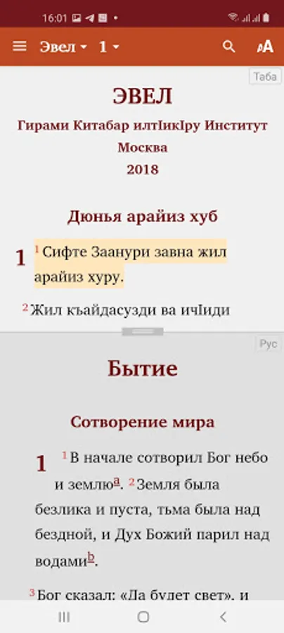 This Scripture app facilitates Bible study in the Tabasaran language. The Russian translation (NRT) can optionally be added in parallel to the Tabasaran text. Users can highlight verses in different colors, make bookmarks, write notes and view their reading history.