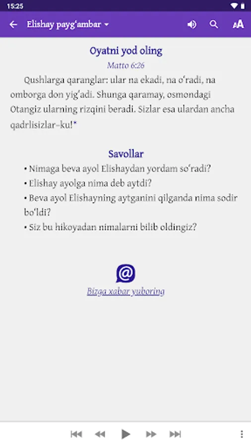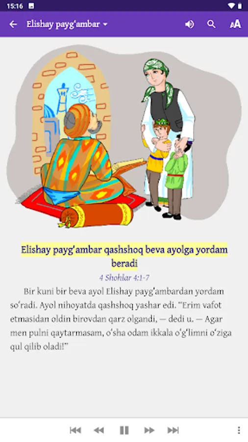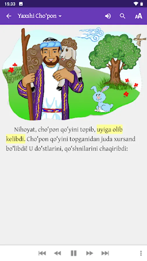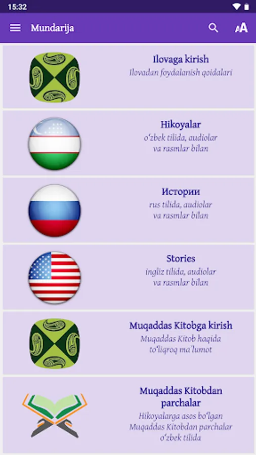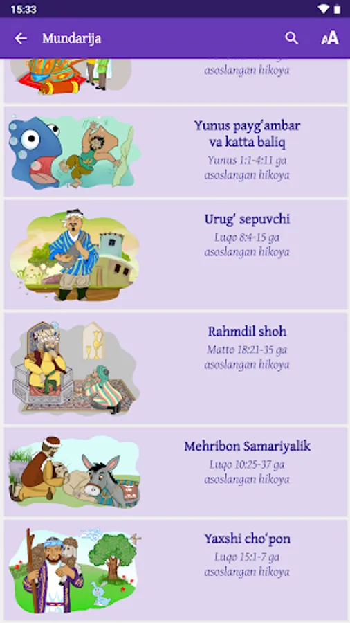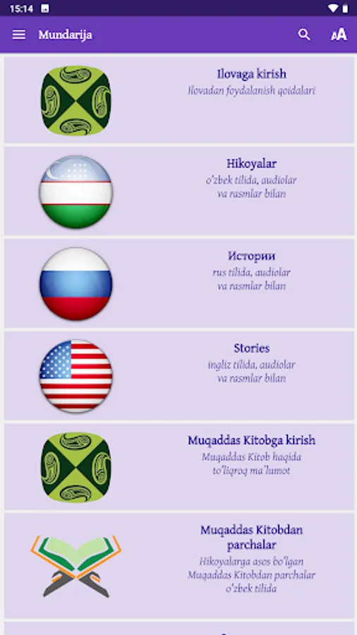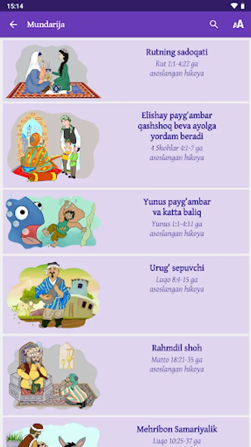 The stories included in this app are based on stories written in the Holy Bible. The Bible has been revered as sacred for more than two thousand years and is rightly considered a classic of the world’s literary heritage. This wonderful app has been created to help both children and their parents learn about the people and events recorded in the Bible. The stories are given in Uzbek, Russian and English, with illustrations and audio.