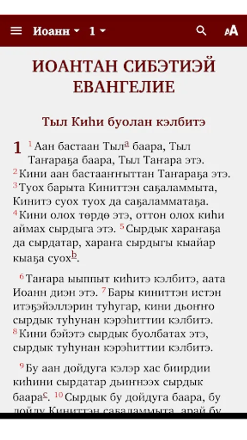 This app is intended for speakers of the Yakut language as well as those who are interested in it. It includes translations of the books of the Bible into the Yakut language by a group of Bible translation and linguistics experts from the Institute of Bible Translation. As the translation project progresses and the translations are published, new texts will be added to the app.