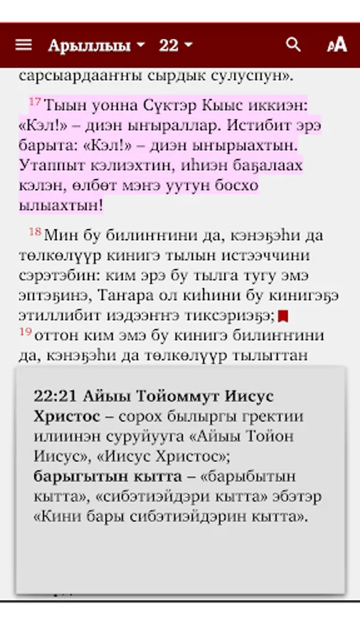 This online application is an in-depth study of Scripture. It contains both the Yakut language translation itself and other translations (in Russian and English), which can be connected in parallel if desired. Users can highlight verses in different colors, place bookmarks, write notes, and view the history of readings.