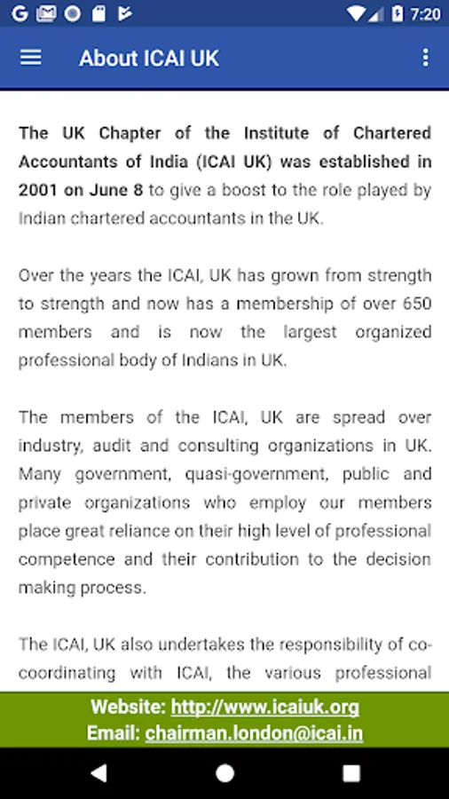 The ICAI UK's mobile application brings you up-to-date key contents from its website http://icaiuk.org/ like Events for Members, Photo Gallery, Newsletter, Discount Schemes, & Chairperson's Message etc. This application is designed & developed for Android Devices. ICAI stakeholders may download mobile application and start using it without any additional cost any time, anywhere.