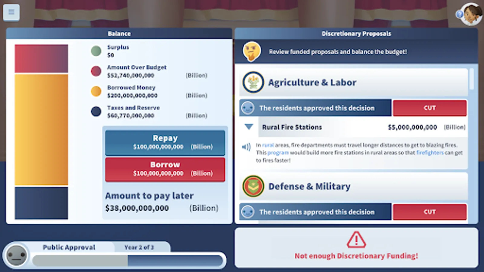 "People's Pie is a balancing act! You must fund important programs without setting tax rates too high or borrowing too much money. To succeed, you
