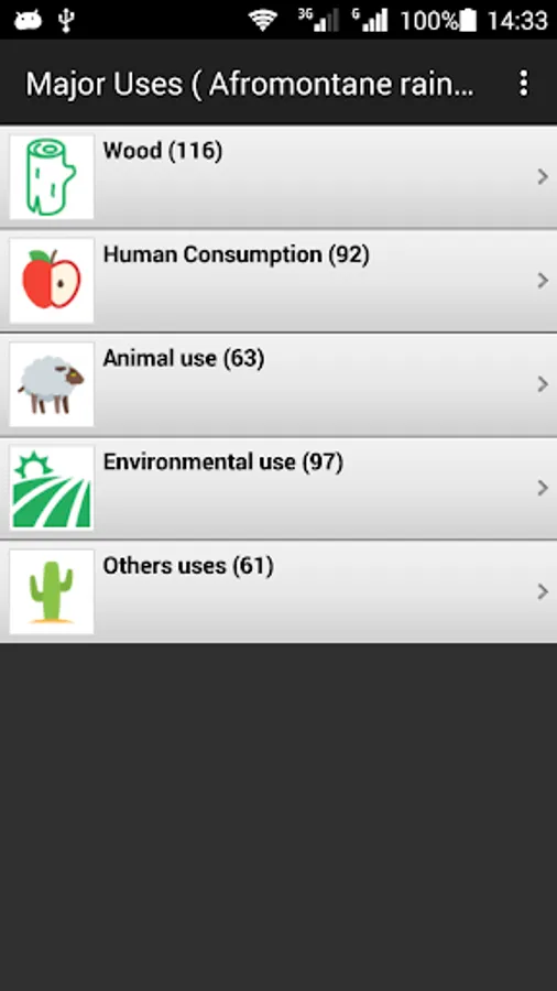 On the major use screen, Five categories are provided namely Wood use, Human consumption, Animal use Environmental use and finally other uses. There are more categories under each major category. When a use drills down to the specific use screen and taps on any specific use, a list of suitable tree species will be listed by their taxonomy names.