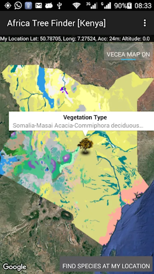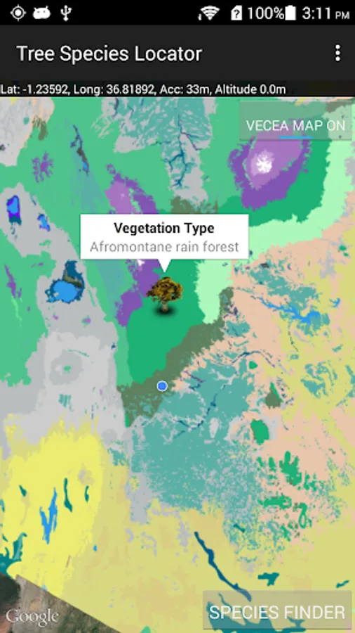 The Africa Tree Finder App enables you to find suitable tree species at your location. Currently the app can only be used within East Africa Country of Kenya, other countries to be included soon. The App works by either allowing you to tap on the "SPECIES FINDER" button on the map, after which you will be directed to the next screen where you will select tree species for a particular use or you can tap directly on any area of the map covered by the tilled VECEA map, after which a marker will appear showing the current vegetation type, when you tap on the maker you will be directed to the major use screen.