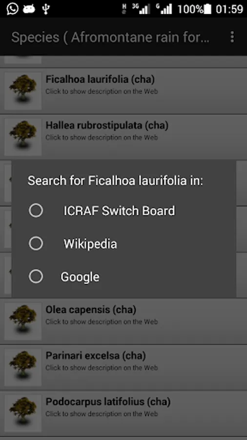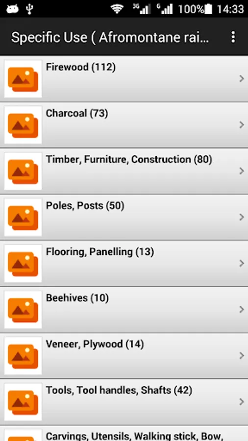 On the major use screen, Five categories are provided namely Wood use, Human consumption, Animal use Environmental use and finally other uses. There are more categories under each major category. When a use drills down to the specific use screen and taps on any specific use, a list of suitable tree species will be listed by their taxonomy names.