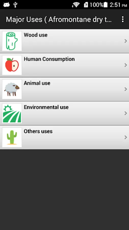 On the major use screen, Five categories are provided namely Wood use, Human consumption, Animal use Environmental use and finally other uses. There are more categories under each major category. When a use drills down to the specific use screen and taps on any specific use, a list of suitable tree species will be listed by their taxonomy names.