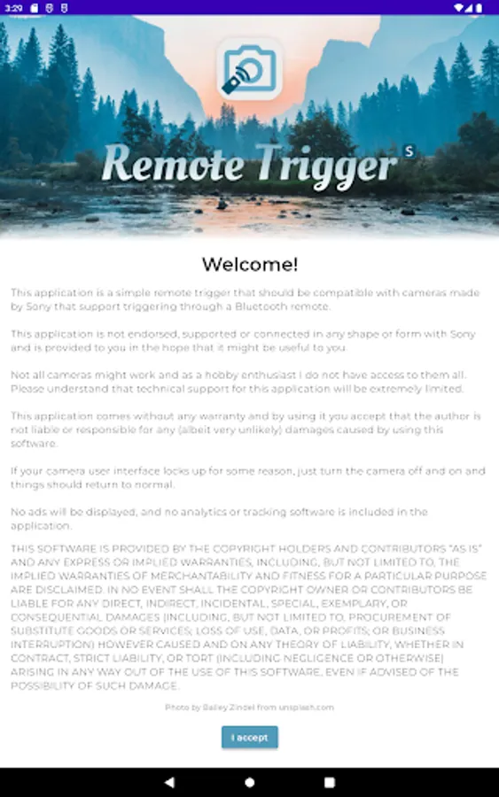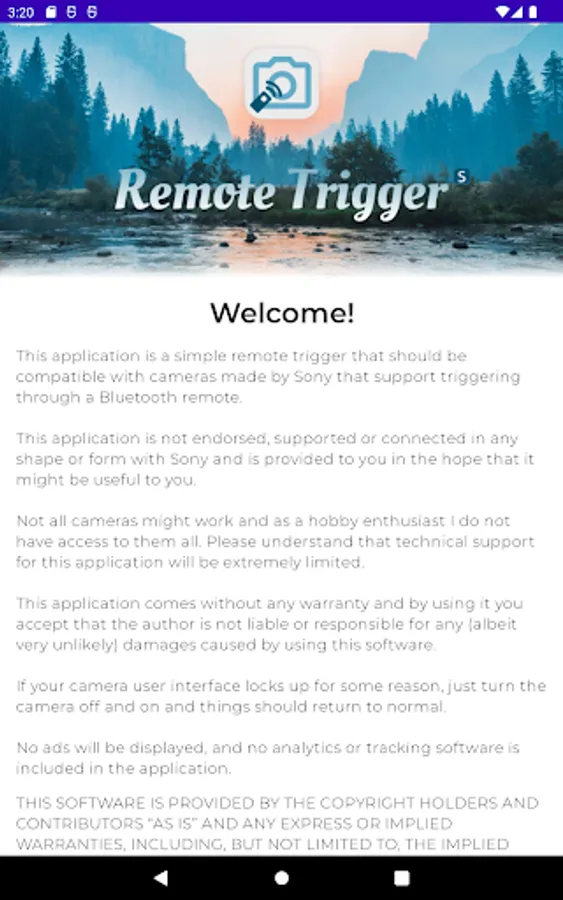 This application is a simple remote trigger that should be compatible with cameras made by Sony that support triggering through a Bluetooth remote.