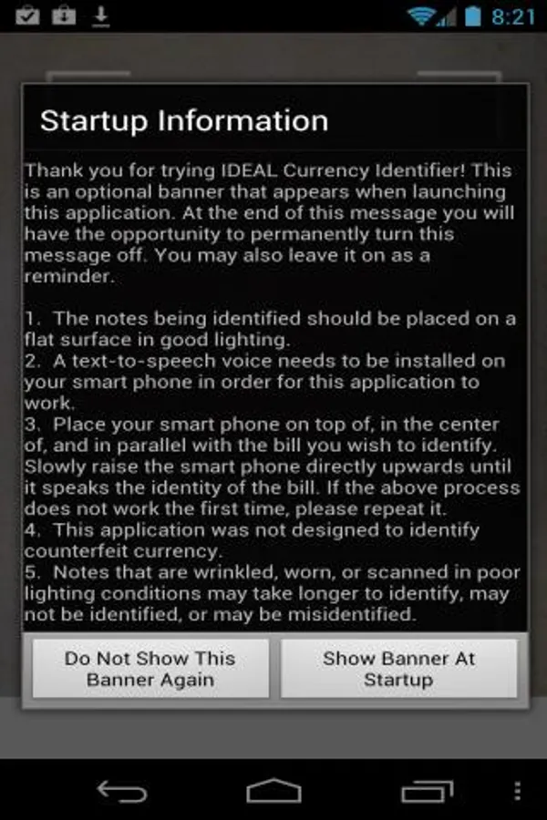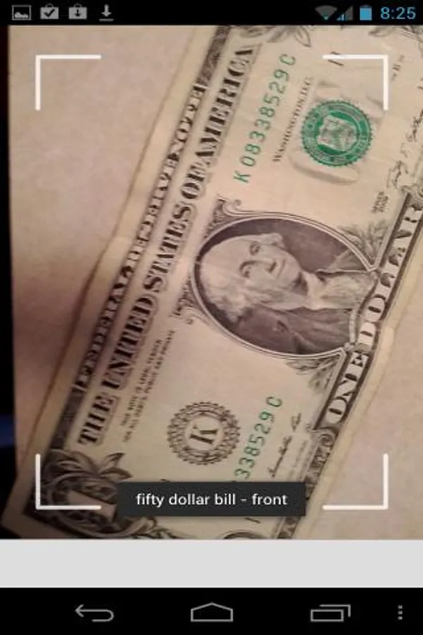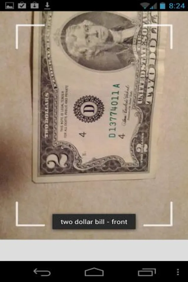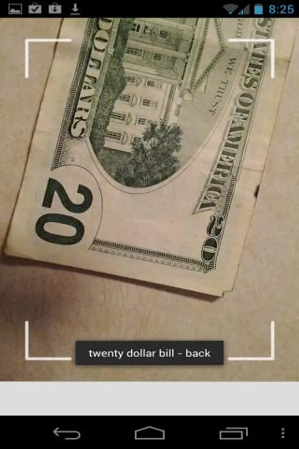 5. Place your Android device on top of, in the middle of; and in parallel with the note you wish to identify.