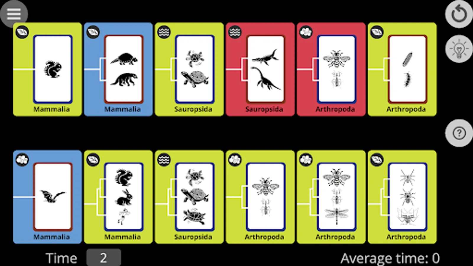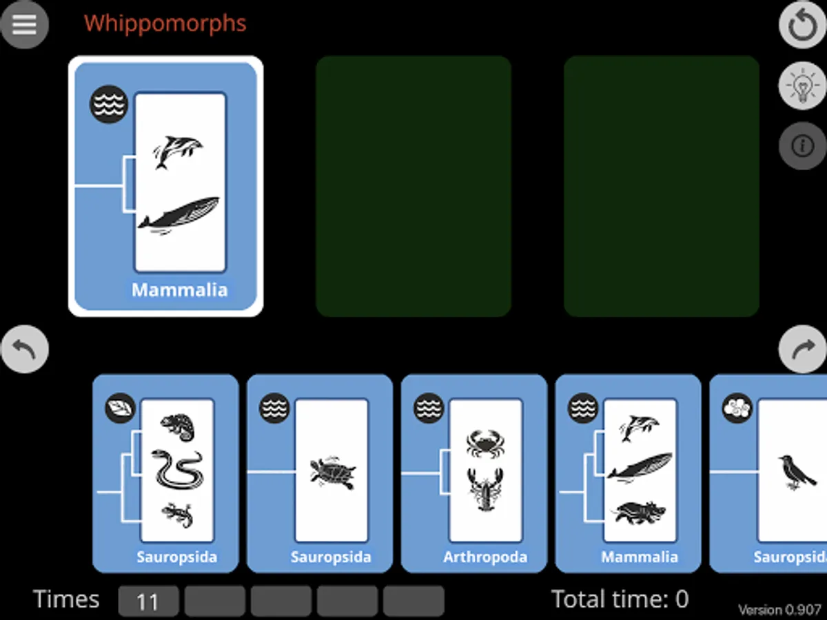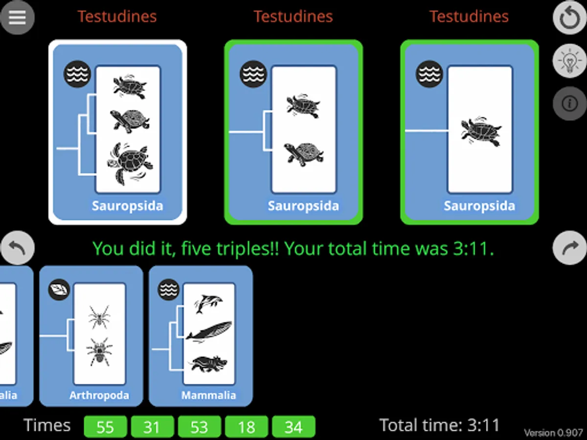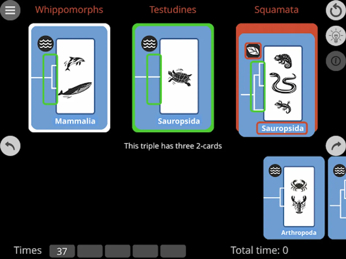 Clades Solo challenges you to match animal cards according to their evolutionary relationships. A “clade” is a complete branch of the evolutionary tree, such as mammals, arthropods, and sauropsids (reptiles and birds together). Can you make a triple match with one card of each clade? What about animals of the water, land, and air? How fast can you spot the two cards that go with the first card to make a “triple”?
