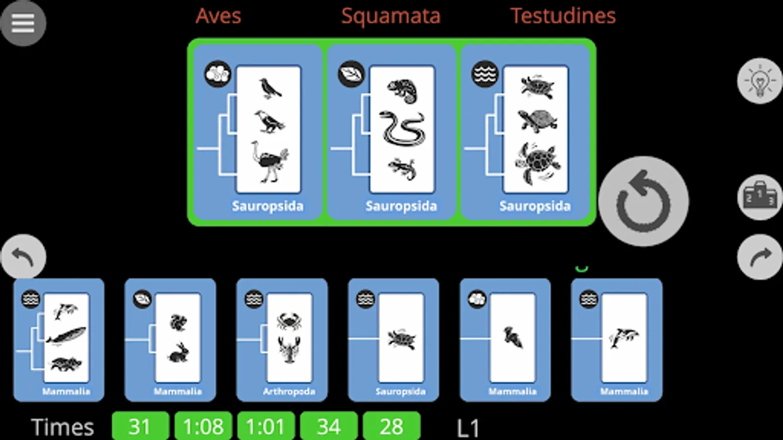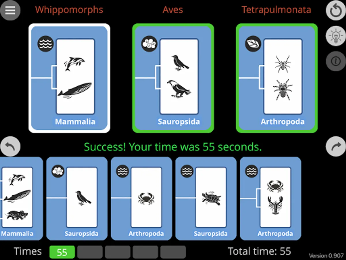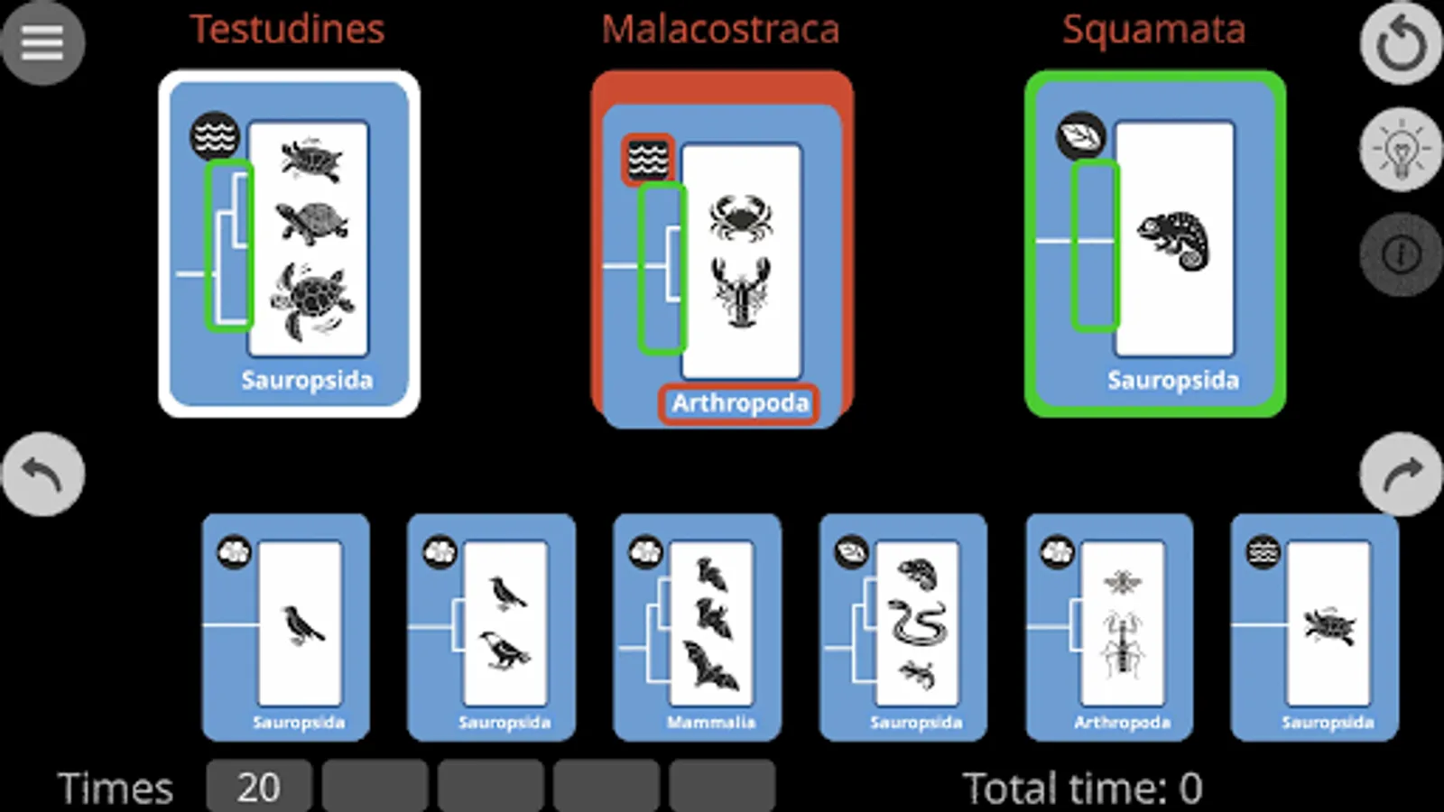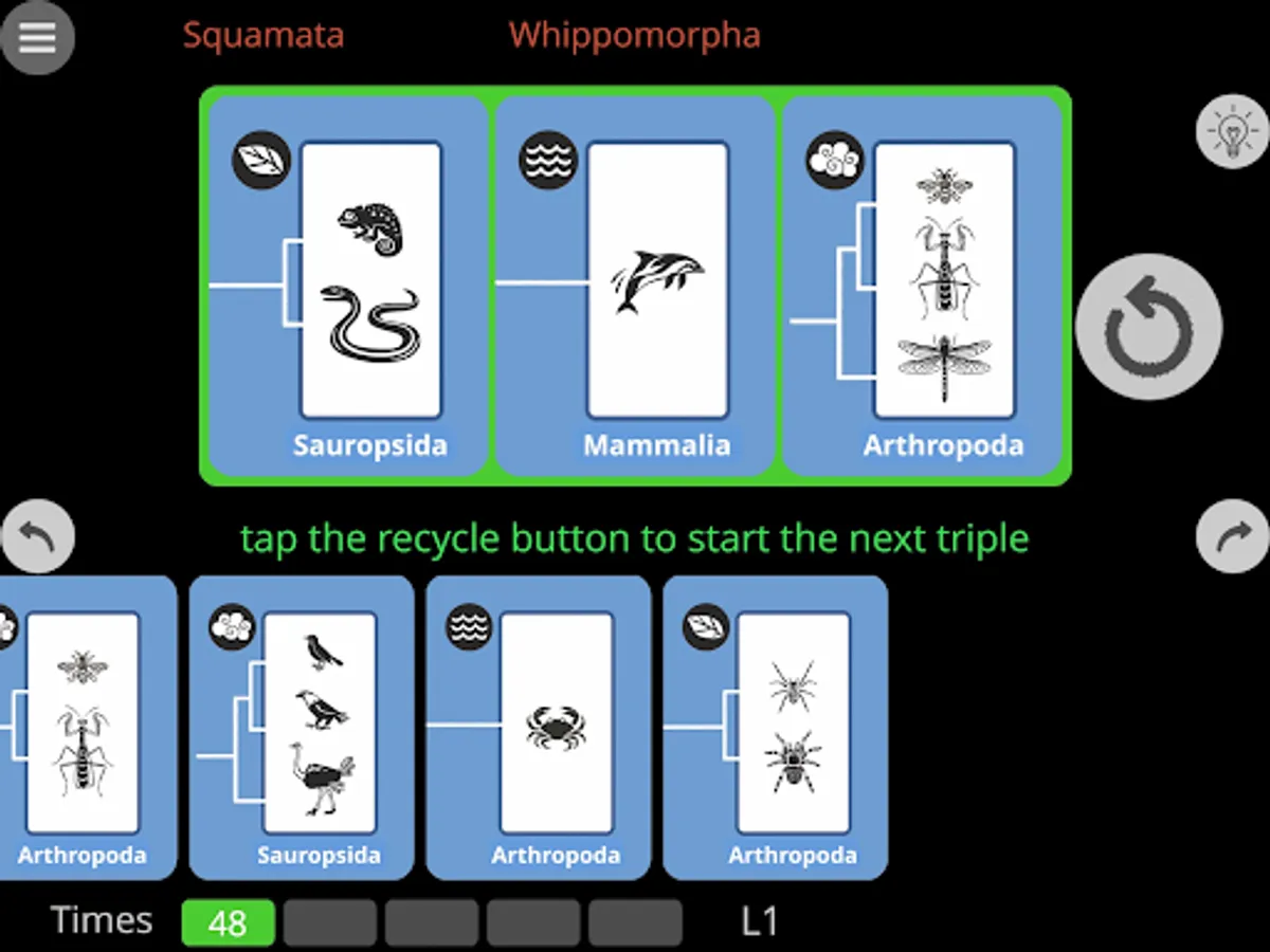 Clades Solo challenges you to match animal cards according to their evolutionary relationships. A “clade” is a complete branch of the evolutionary tree, such as mammals, arthropods, and sauropsids (reptiles and birds together). Can you make a triple match with one card of each clade? What about animals of the water, land, and air? How fast can you spot the two cards that go with the first card to make a “triple”?