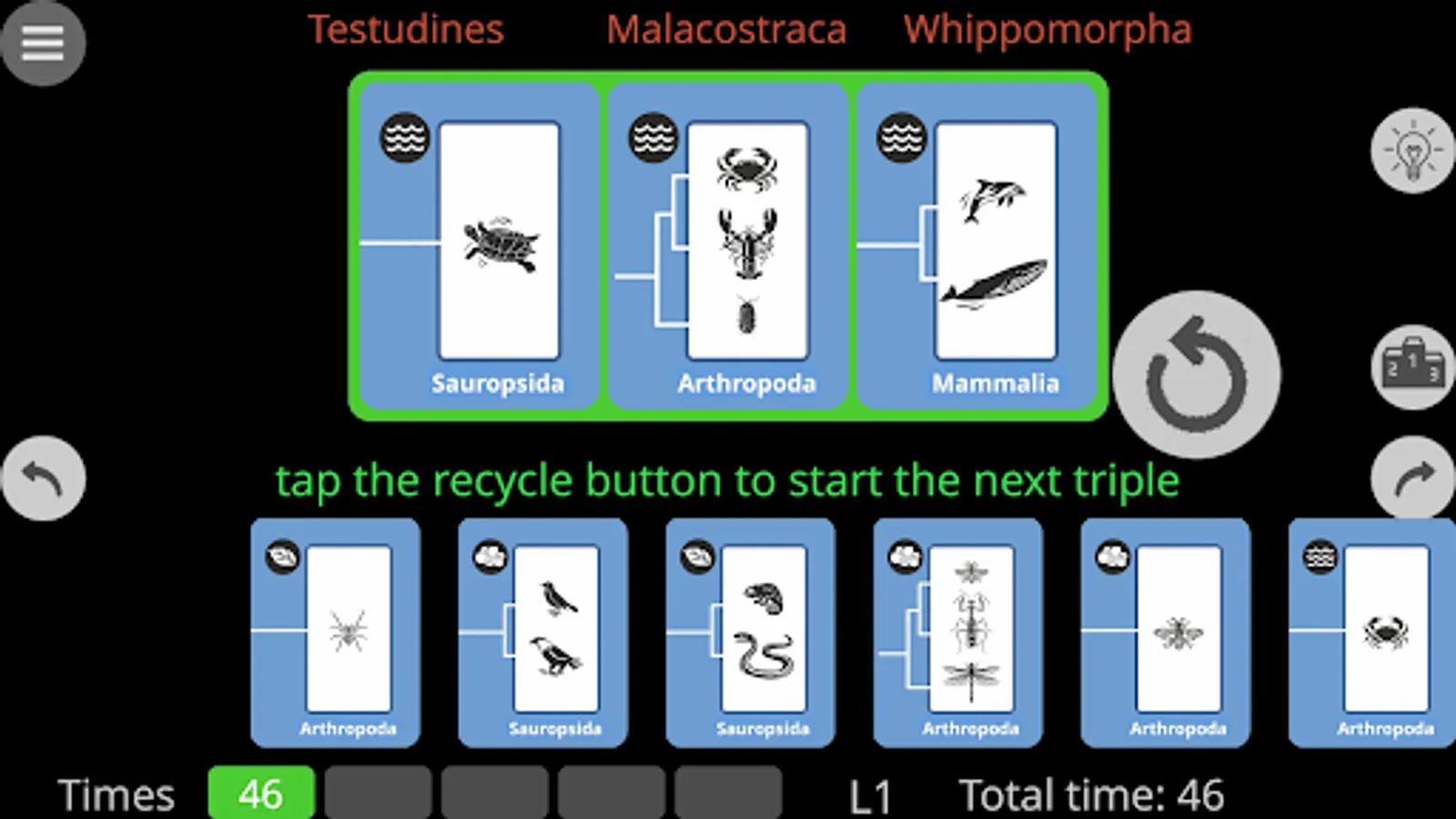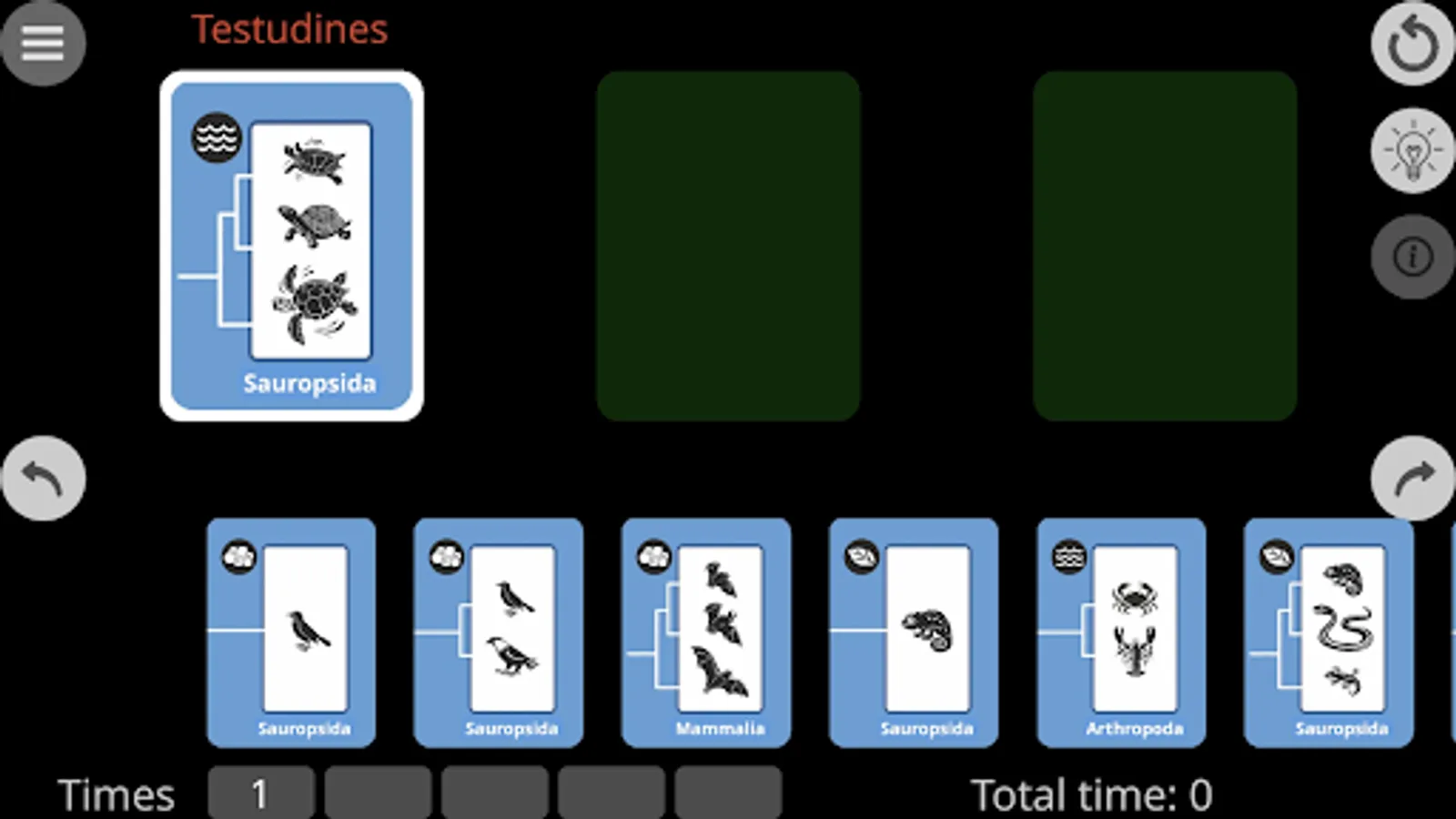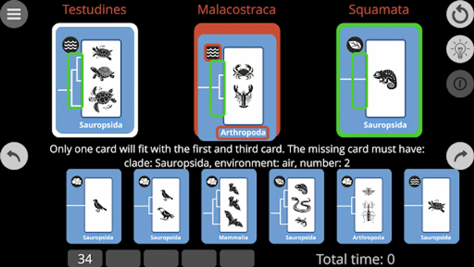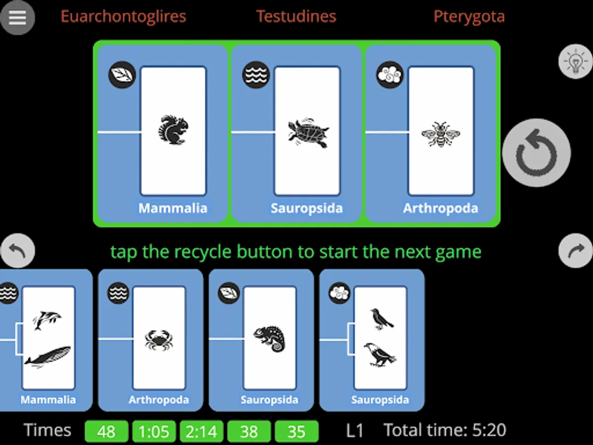 Clades Solo challenges you to match animal cards according to their evolutionary relationships. A “clade” is a complete branch of the evolutionary tree, such as mammals, arthropods, and sauropsids (reptiles and birds together). Can you make a triple match with one card of each clade? What about animals of the water, land, and air? How fast can you spot the two cards that go with the first card to make a “triple”?