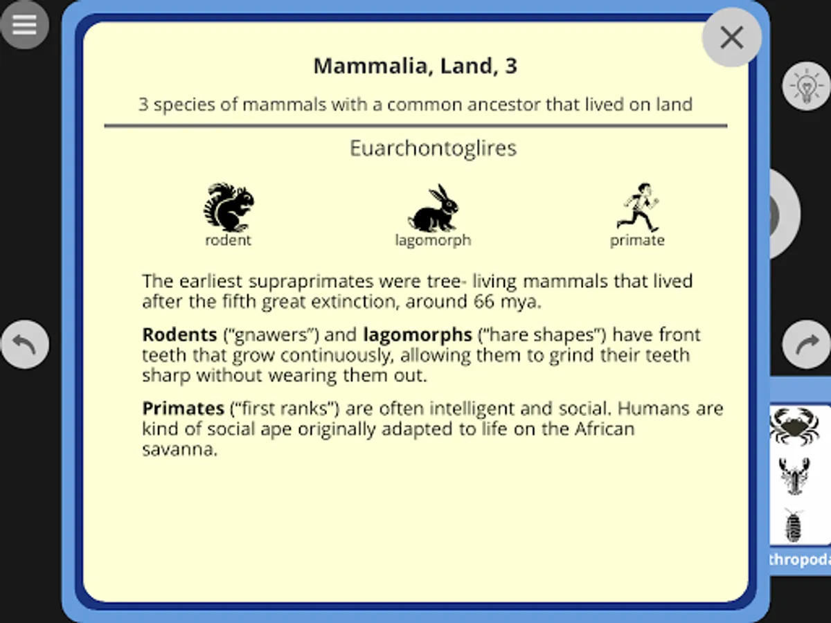* Science notes about the three larger clades and the nine smaller clades, including bats, primates, whales, birds, lizards, winged insects, spiders, and crabs.