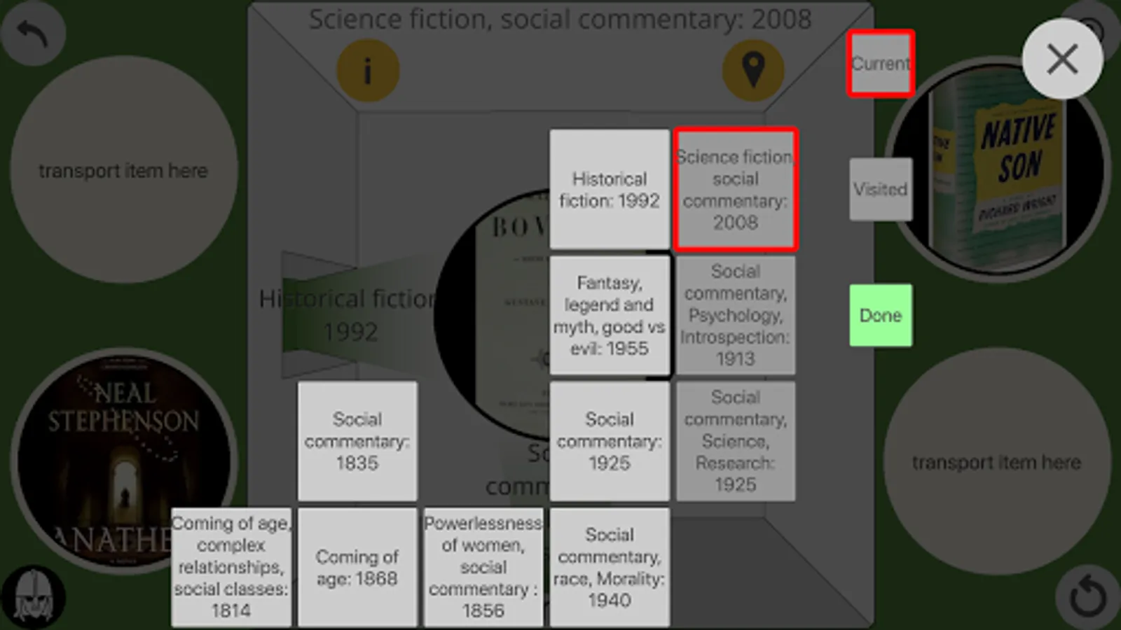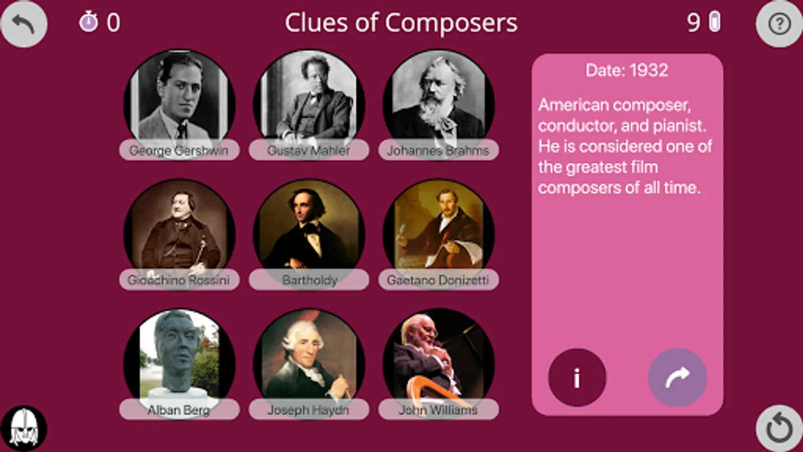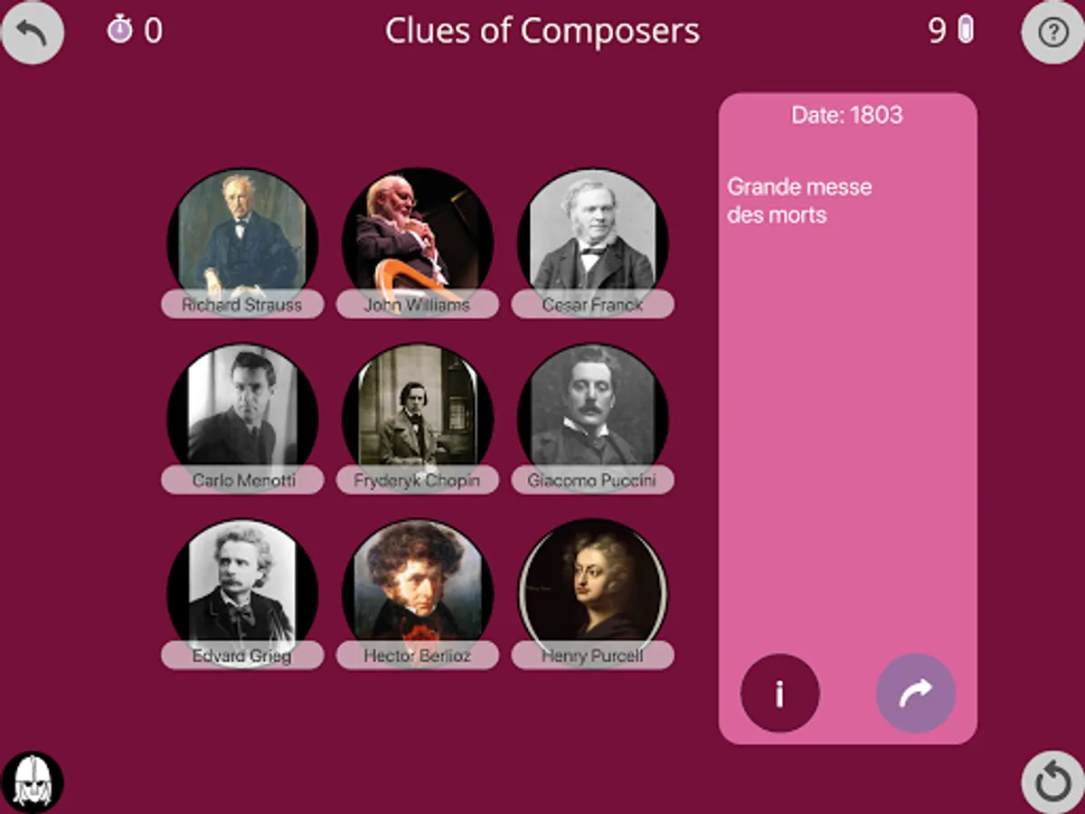 How fast can you identify an item (book, museum object, movie, science discovery, composer) from a clue? Clues is a quick but tricky clue-event matching game, where the clues can be quotes, descriptions, categories, name of a piece of music or painting. You are given 9 images, and presented one clue at a time.
