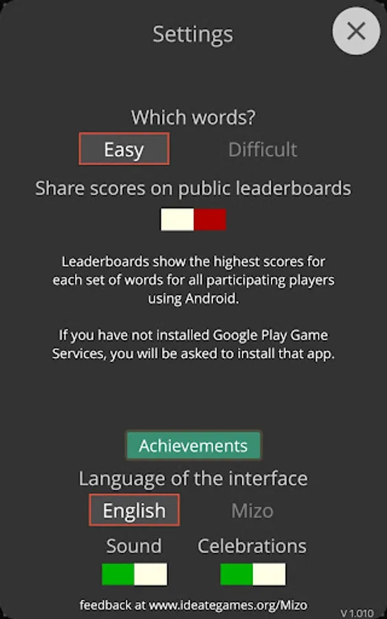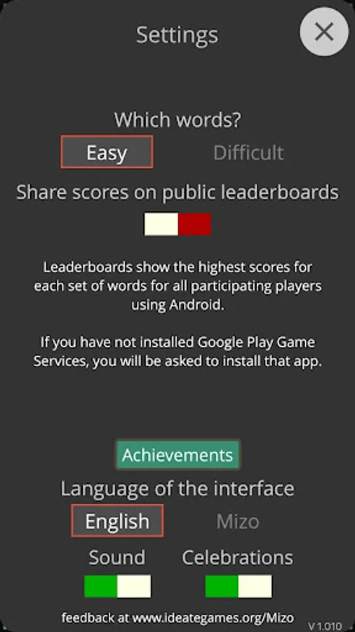 Fast spelling game for words in the Mizo language. Easy and Difficult sets of words, celebrations for each success, leaderboards for each set of words and for the combined total.