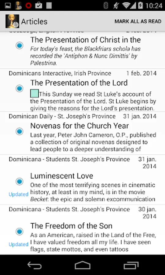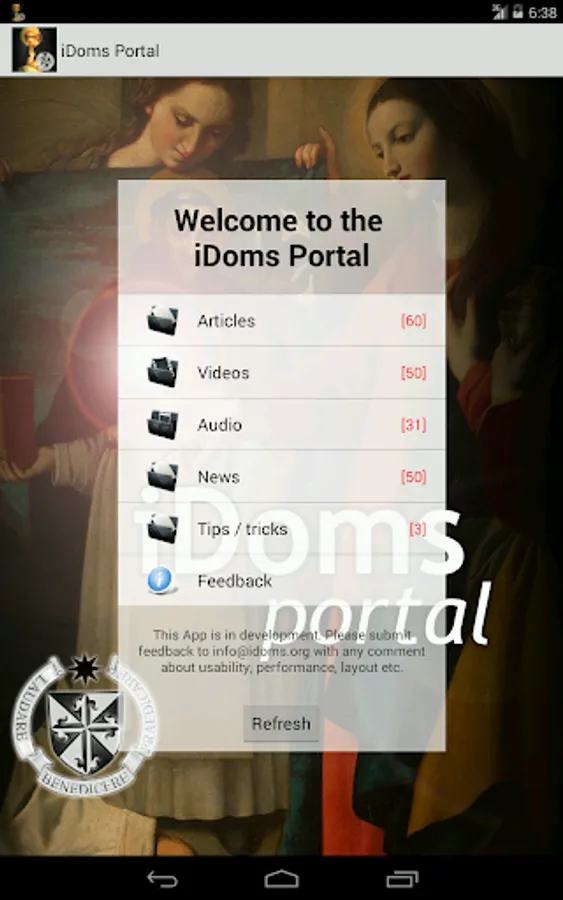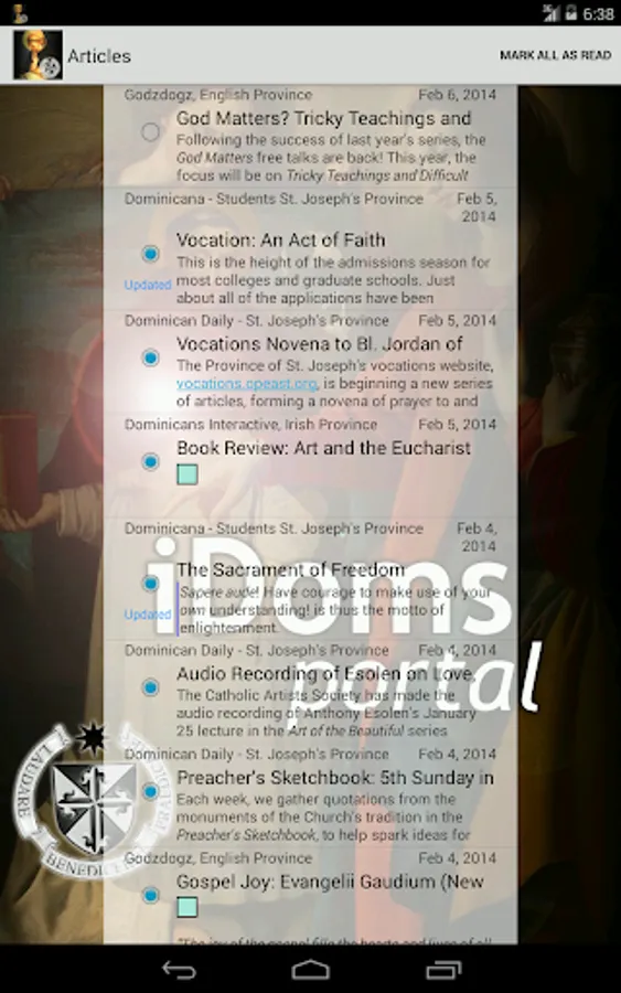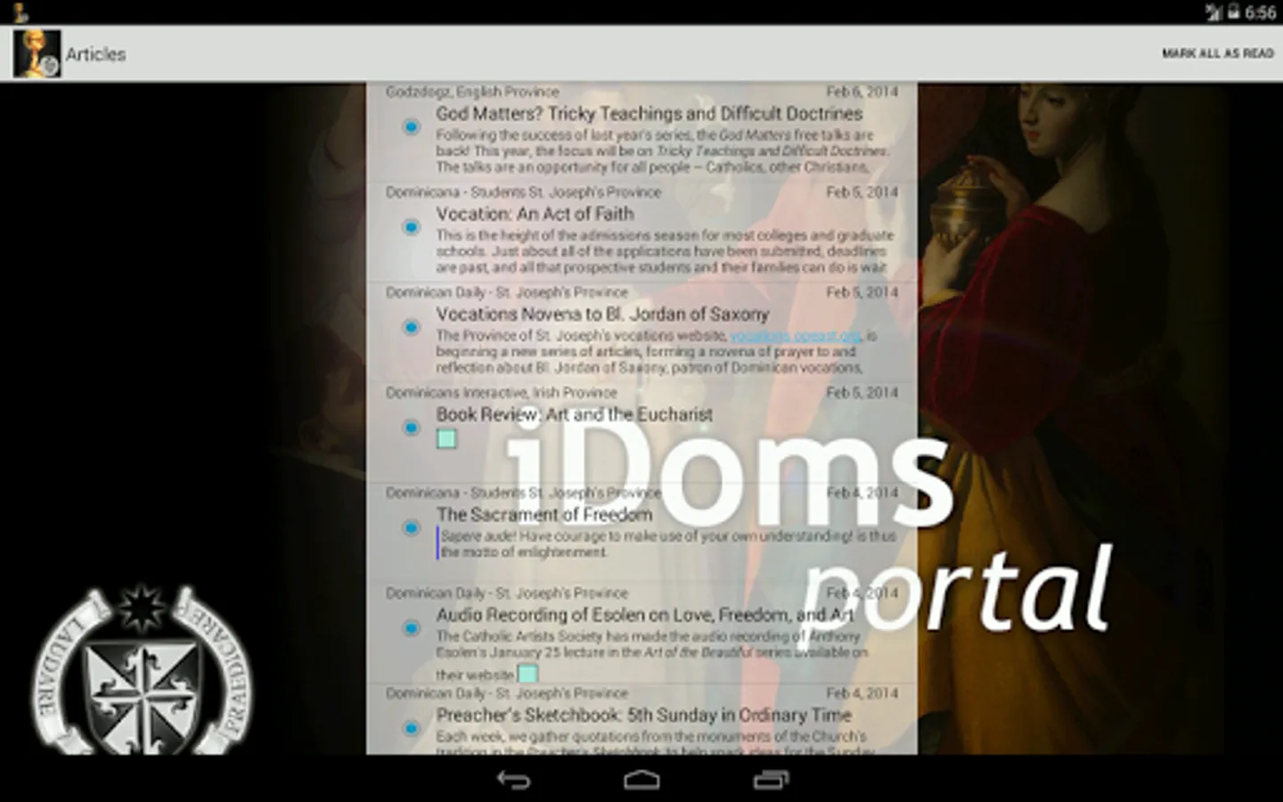 The iDoms portal provides access to articles, videos and audio files aggregated from websites of the Dominican Order. Currently the portal includes content in English from: