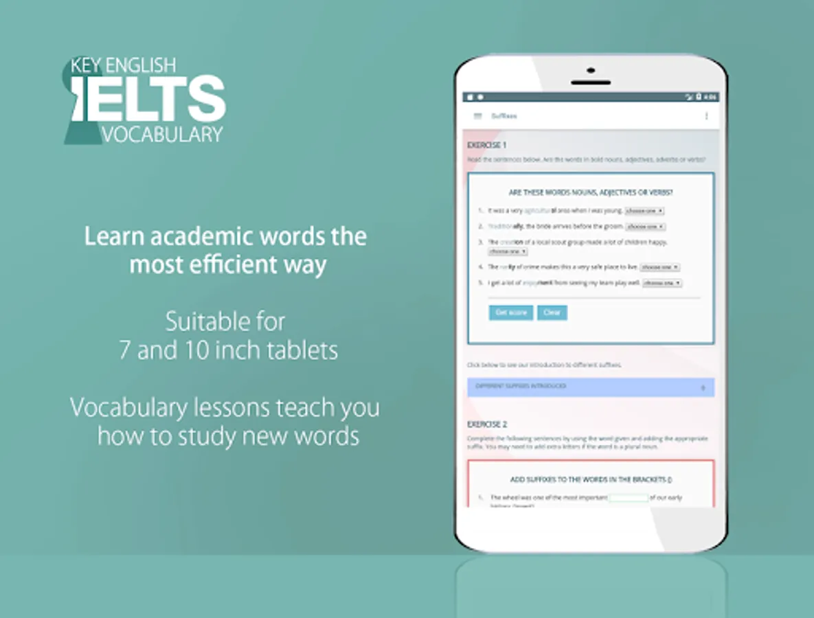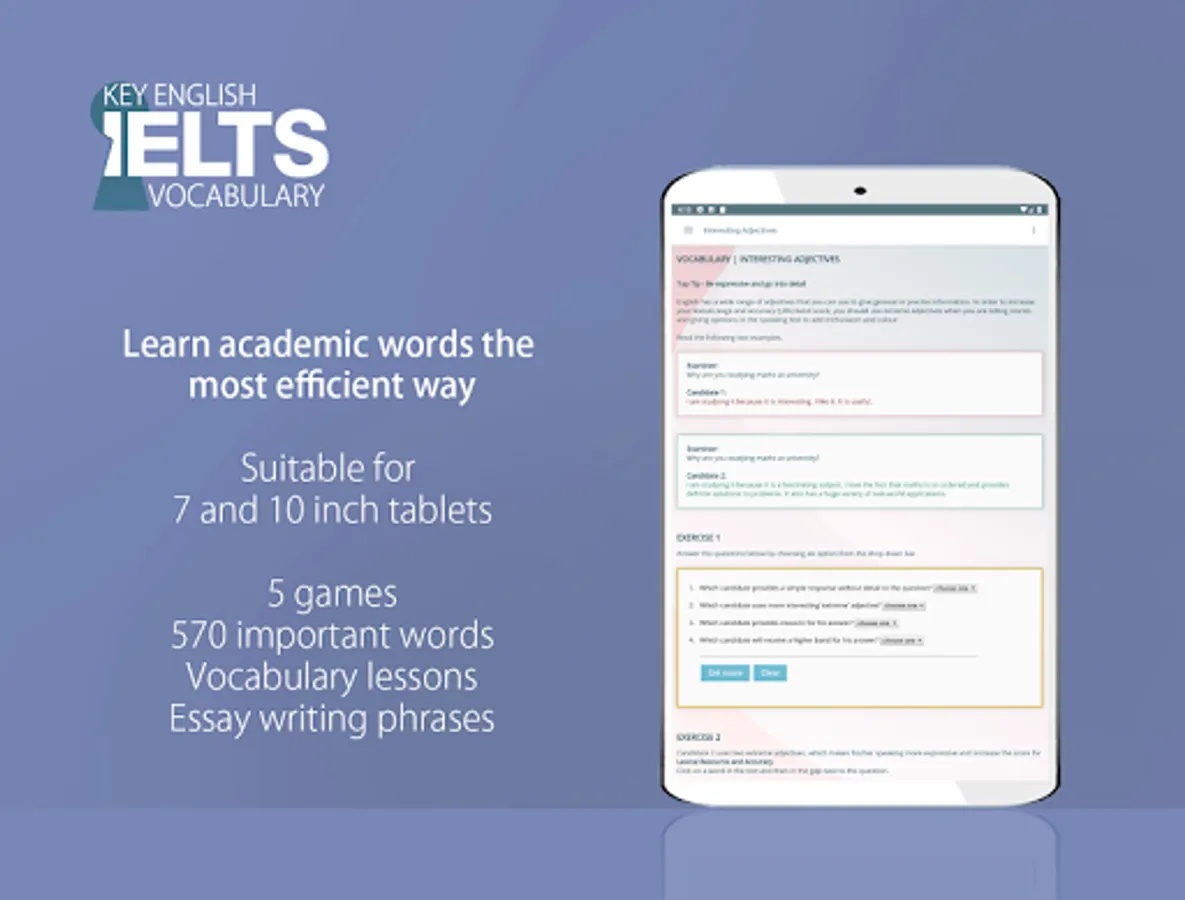 This app contains no ads and all its features are free. If you want to support us, you can make an in-app donation or pay a small fee to have your essays marked with feedback emailed to you by our experienced IELTS teachers.