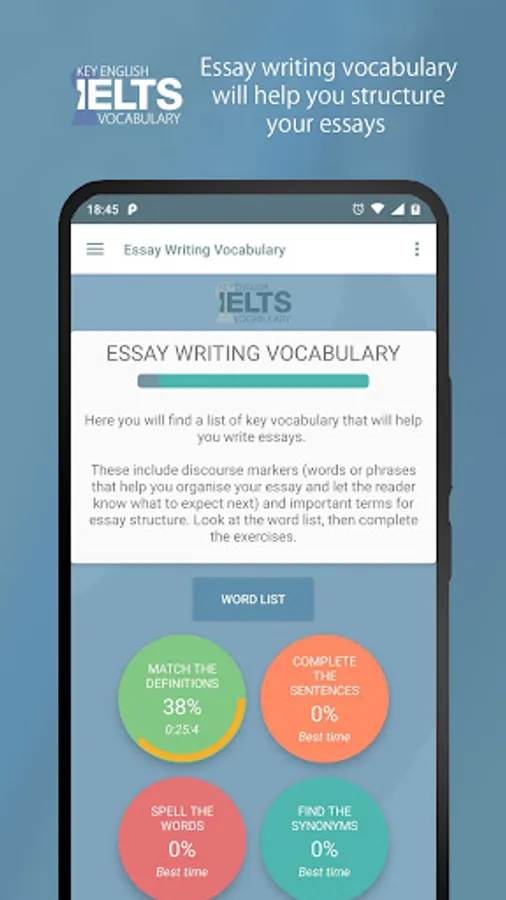 The best way to learn vocabulary is to start with the most common words. Key English | IELTS Vocabulary will teach you the most frequent words in Academic, IELTS and TOEFL English texts. It also has an IELTS Writing Task 2 section to help you develop your essay writing!