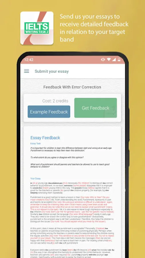 This app contains no ads and all its features are free. If you want to support us, you can make an in-app donation or pay a small fee to have your essays marked with feedback emailed to you by our experienced IELTS teachers.